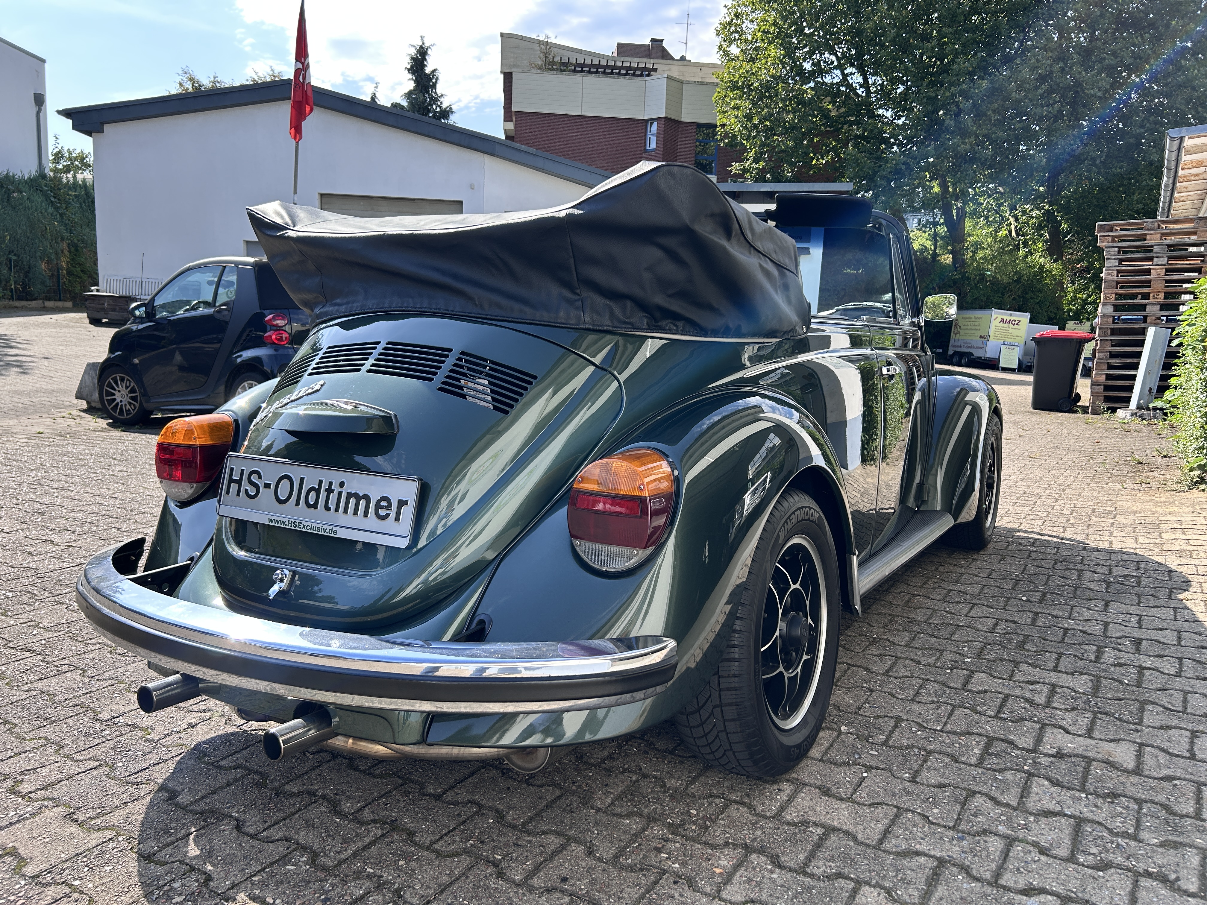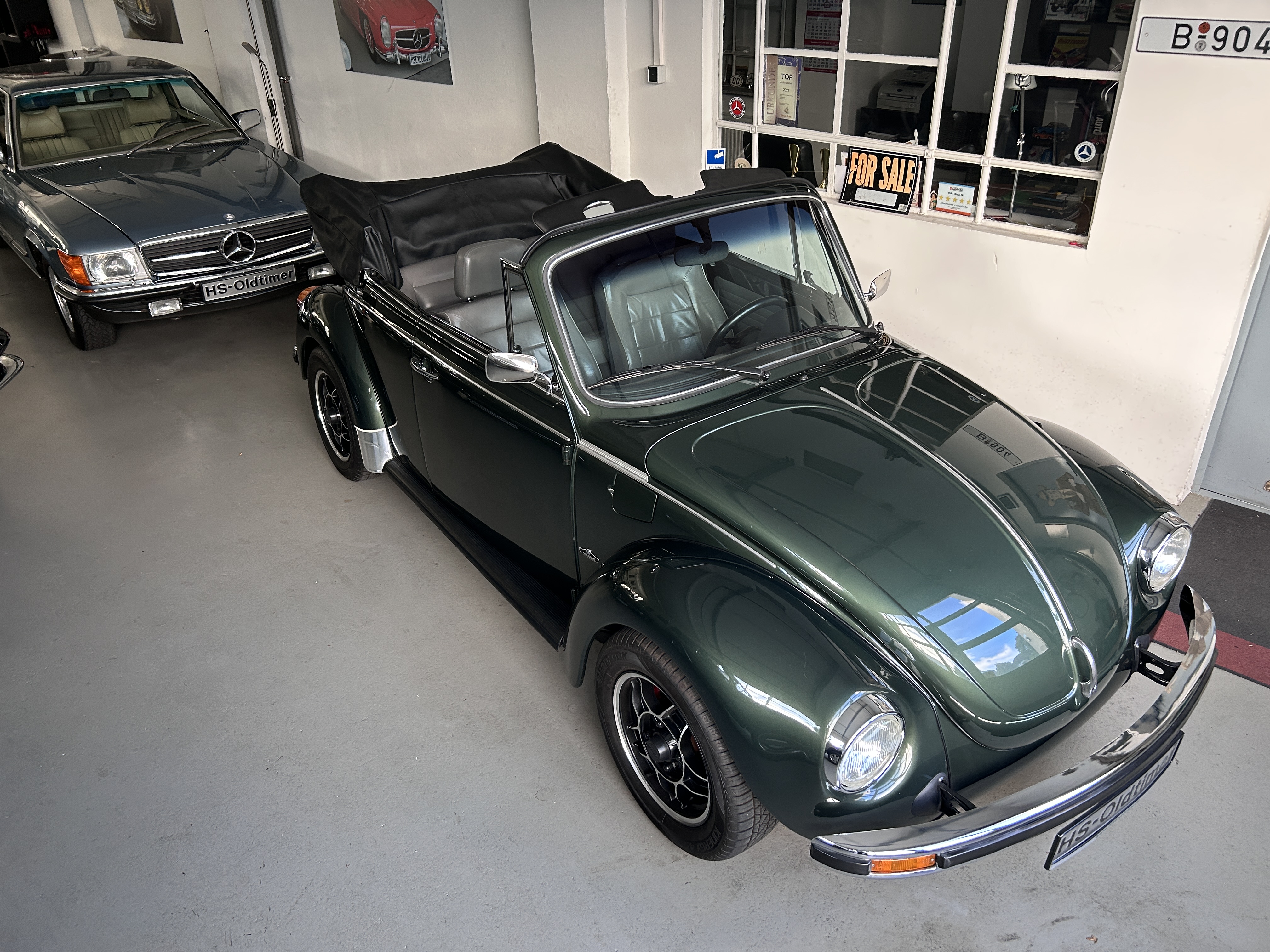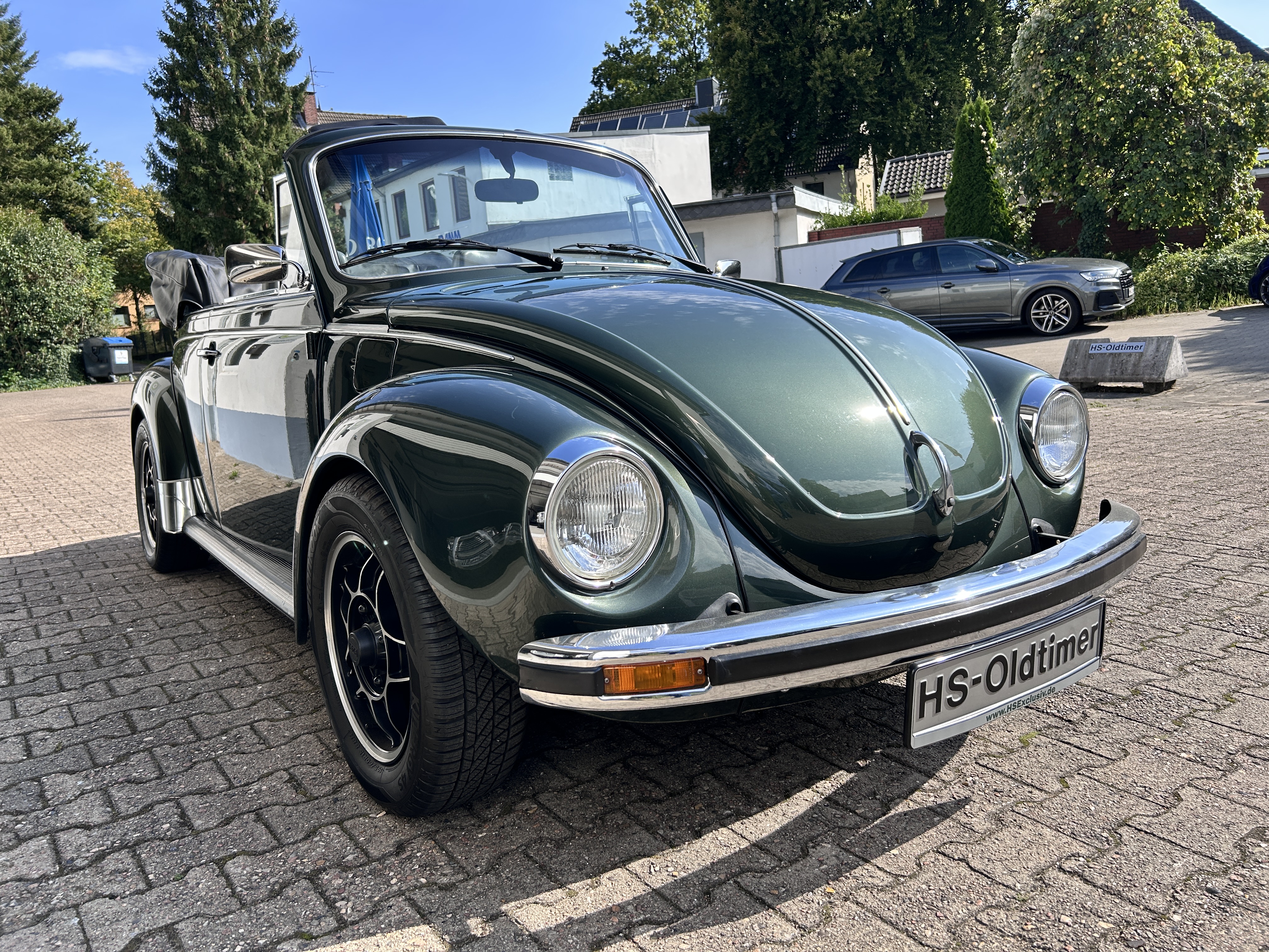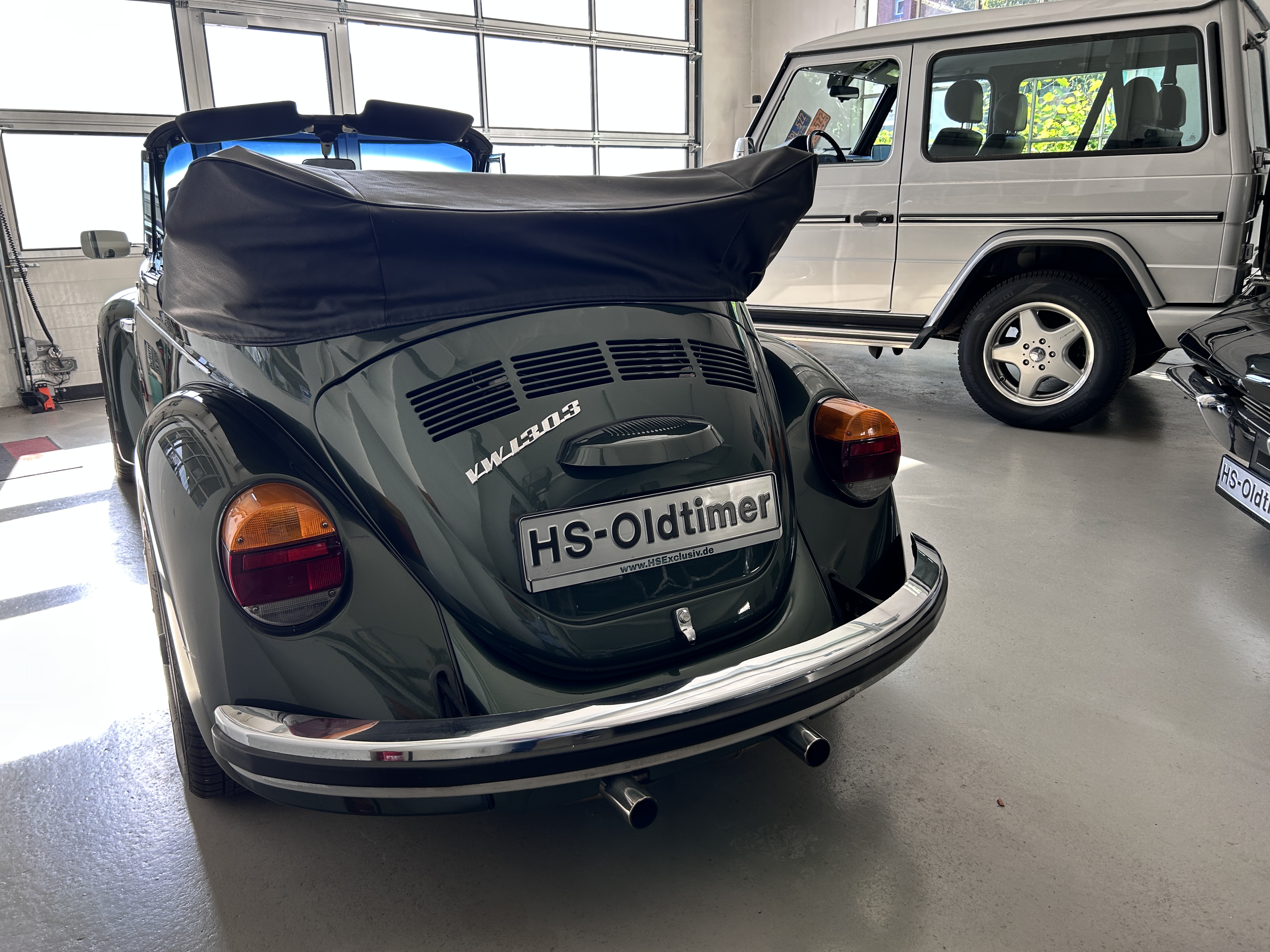 Ein beeindruckendes Käfer 1303 LS Cabriolet in dunkelgrün Metallic. Kaum Gebrauchsspuren. Super Karosserie, Rost haben wir auch an den typischen Stellen nicht gefunden. Die Spaltmaße sind auch sehr gut. Der Eigentümer hat sein Cabriolet intensiv gepflegt und viel Geld in Optik und Technik investiert und sogar einige Porsche Teile verbaut. Dieser VW fährt sich unglaublich gut und klingt sehr kernig durch den dezenten Sportauspuff. Der Motor läuft phantastisch und die Schaltung ist nicht im geringsten hakelig. Wir haben schon einige schöne 1303 hier gehabt, aber so ein besonderes Exemplar noch nicht. Die Leistungssteigerung auf ca. 70 PS macht sich sehr positiv bemerkbar im heutigen Straßenverkehr und schont den Motor. Es wurde alles Eingetragen und er hat natürlich auch eine H-Abnahme. Wer einen der Besten Käfer sucht, sollte sich diesen auf jeden Fall anschauen, es lohnt sich wie immer bei uns! Wir freuen uns auf Ihren Anruf und Besuch. Weitere schöne Oldtimer finden Sie auf unserer eigenen Homepage: HS-Oldtimer.de