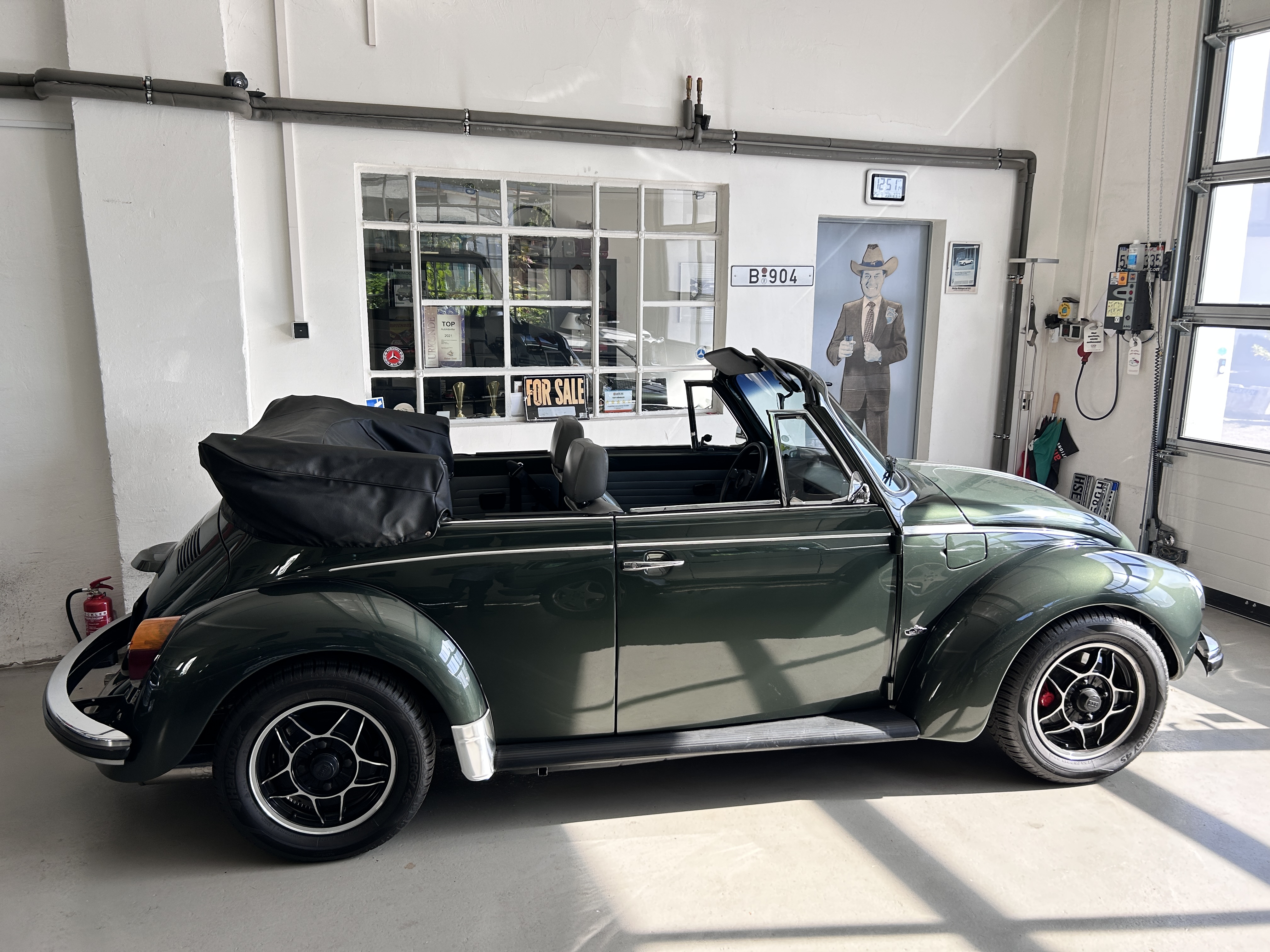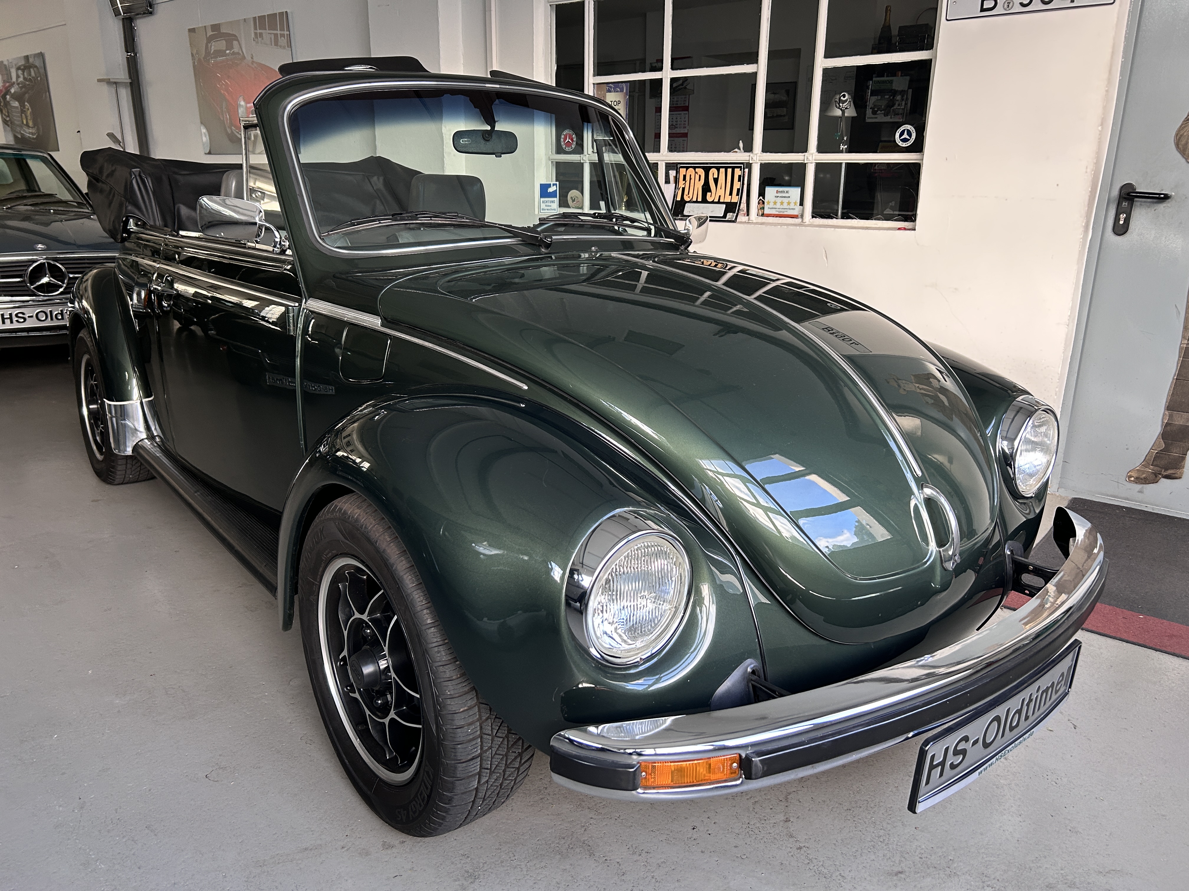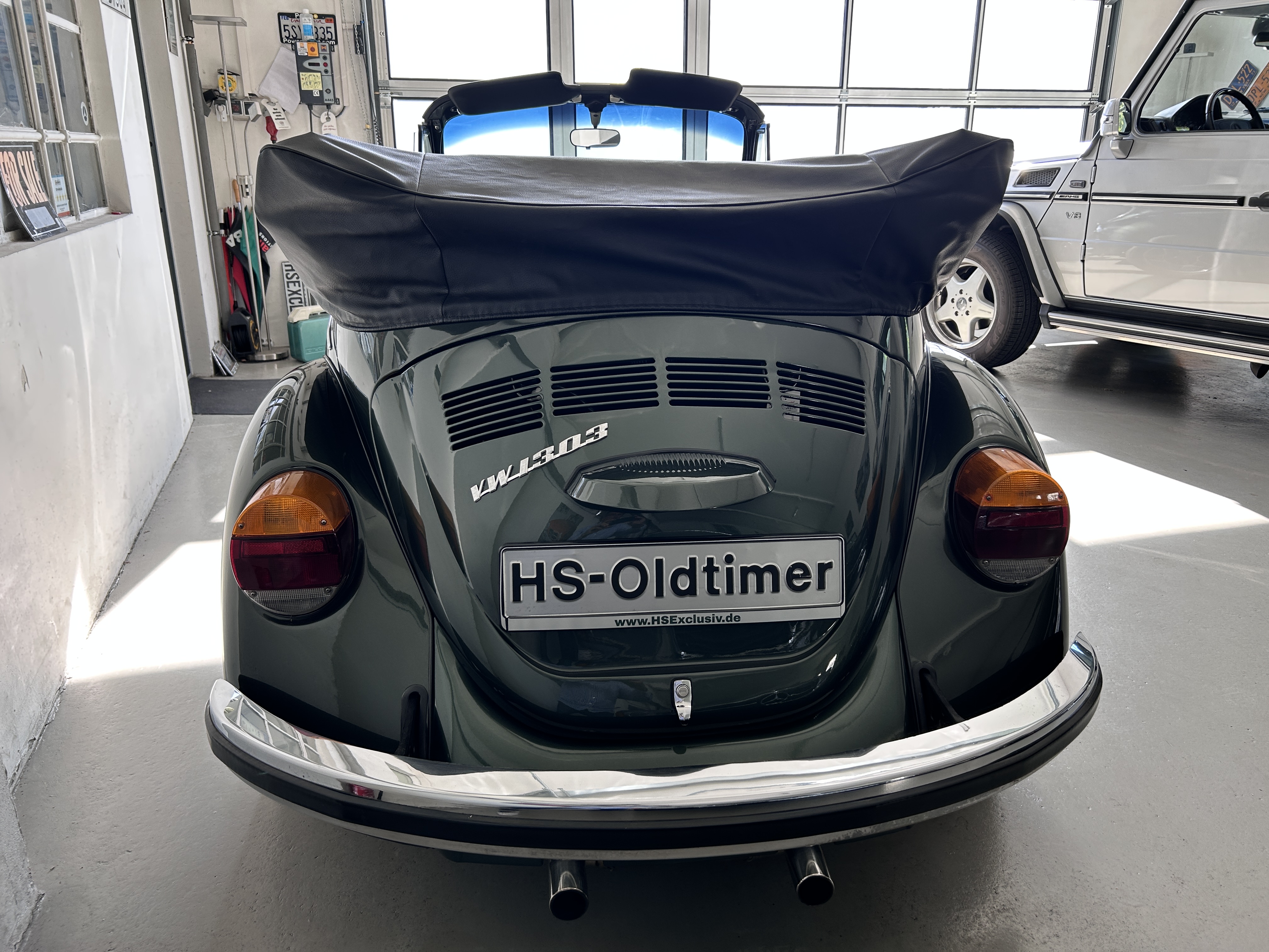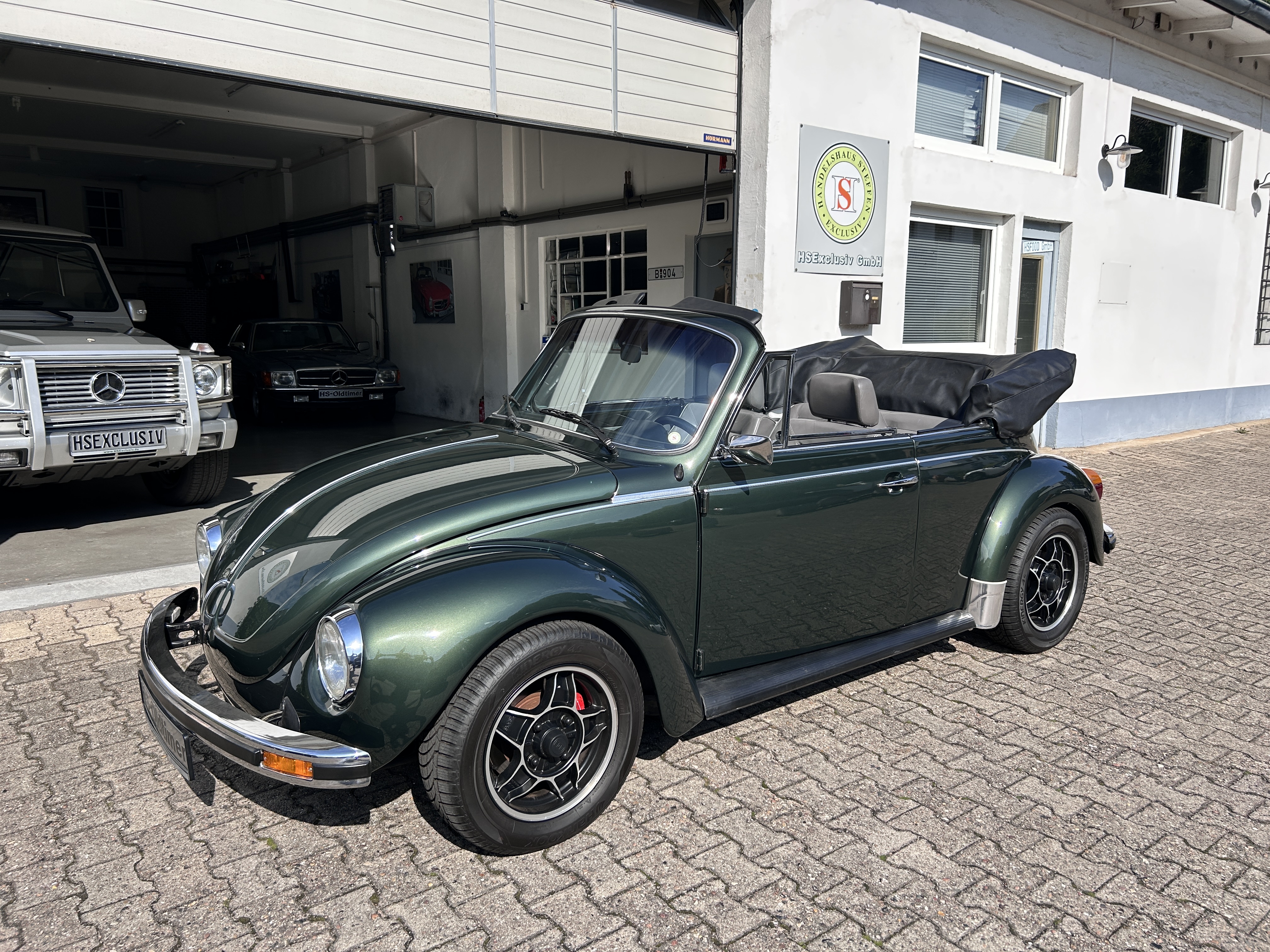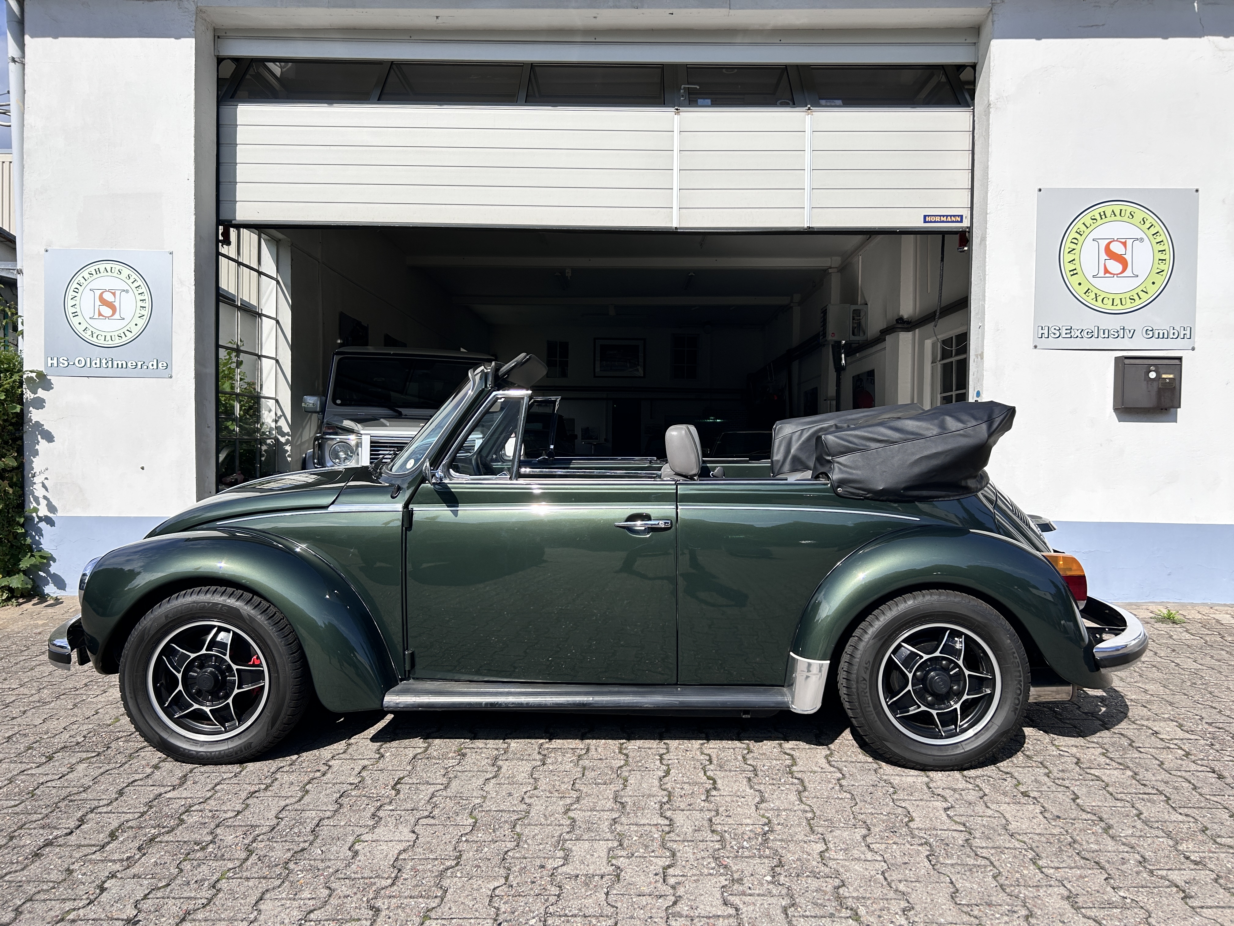 Ein beeindruckendes Käfer 1303 LS Cabriolet in dunkelgrün Metallic. Kaum Gebrauchsspuren. Super Karosserie, Rost haben wir auch an den typischen Stellen nicht gefunden. Die Spaltmaße sind auch sehr gut. Der Eigentümer hat sein Cabriolet intensiv gepflegt und viel Geld in Optik und Technik investiert und sogar einige Porsche Teile verbaut. Dieser VW fährt sich unglaublich gut und klingt sehr kernig durch den dezenten Sportauspuff. Der Motor läuft phantastisch und die Schaltung ist nicht im geringsten hakelig. Wir haben schon einige schöne 1303 hier gehabt, aber so ein besonderes Exemplar noch nicht. Die Leistungssteigerung auf ca. 70 PS macht sich sehr positiv bemerkbar im heutigen Straßenverkehr und schont den Motor. Es wurde alles Eingetragen und er hat natürlich auch eine H-Abnahme. Wer einen der Besten Käfer sucht, sollte sich diesen auf jeden Fall anschauen, es lohnt sich wie immer bei uns! Wir freuen uns auf Ihren Anruf und Besuch. Weitere schöne Oldtimer finden Sie auf unserer eigenen Homepage: HS-Oldtimer.de