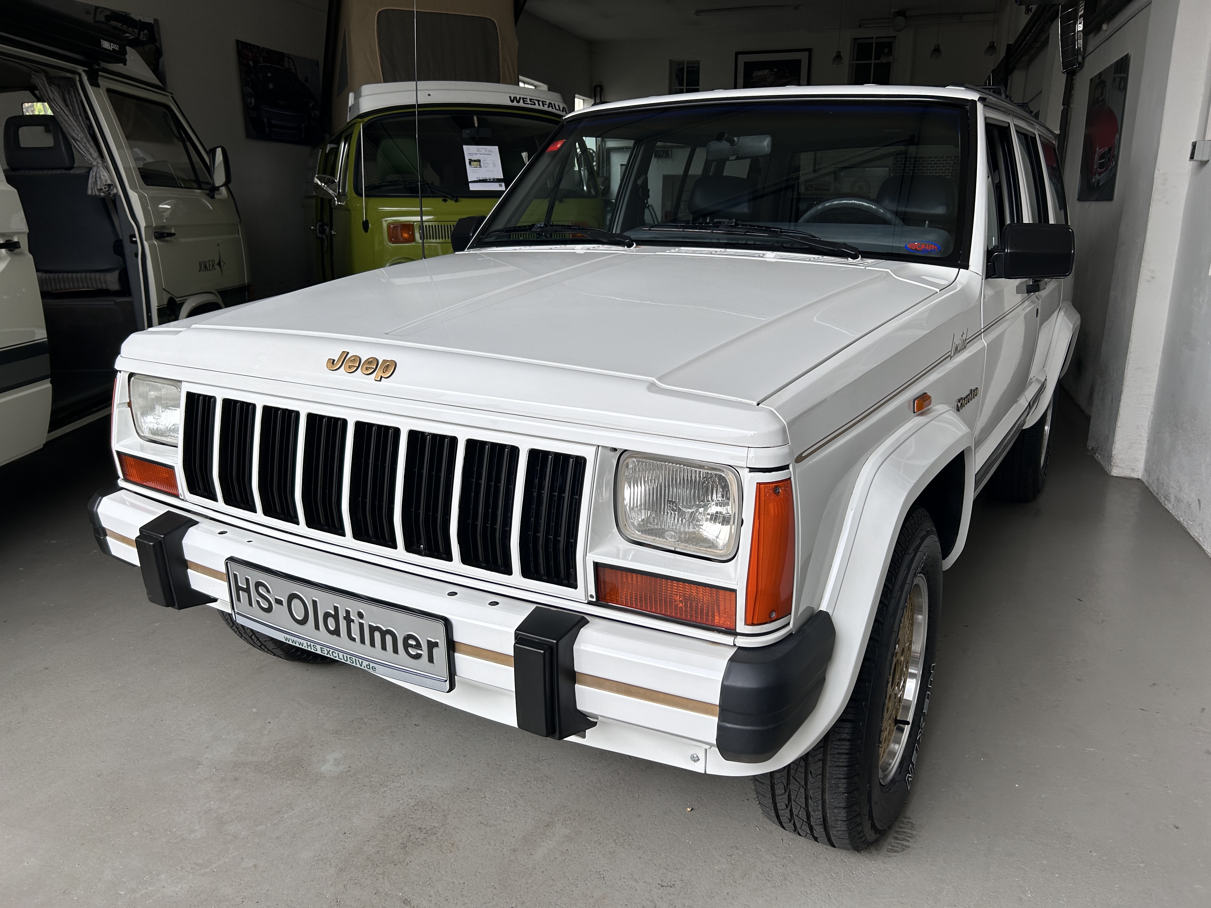 Sehr gepflegter Jeep Cherokee aus Spanien. Umfangreich überarbeitet, inkl. neuem TÜV und einer H-Abnahme. Der Motor läuft schön rund und die Automatik schaltet sauber. Kein ABS. Der 4.0 L fährt sich phantastisch. Der Innenraum ist noch original und sehr gut erhalten. Der Lack ist neuwertig. Minimalste Gebrauchsspuren. Wer einen richtig guten, originalen Limited 4.0 sucht, sollte sich diesen auf jeden Fall einmal anschauen, es lohnt sich wie immer bei uns. Wir freuen uns auf Ihren Anruf und Besuch. Weitere Infos und schöne Oldtimer finden Sie auf unserer eigenen Homepage: www.hs-oldtimer.de