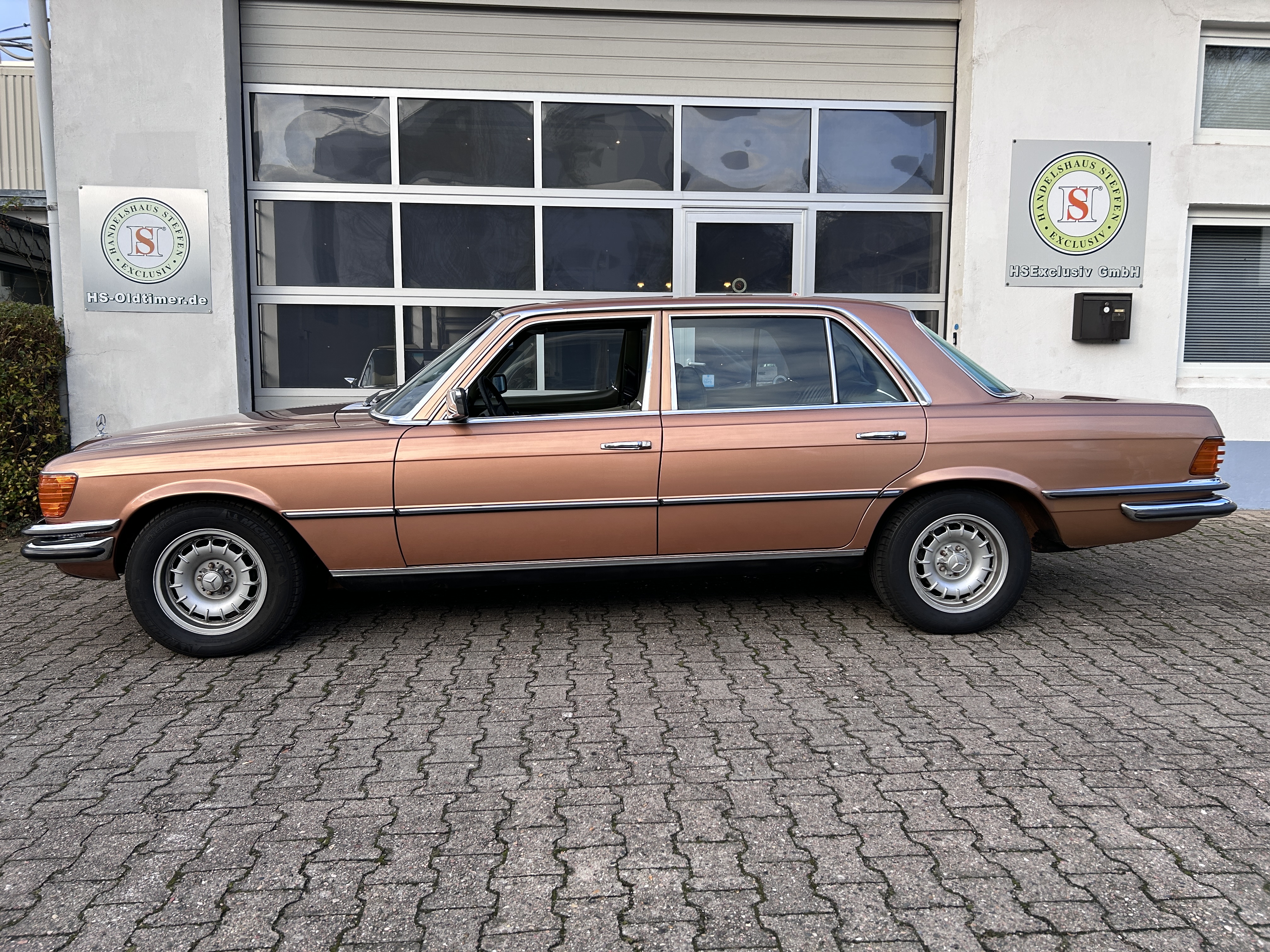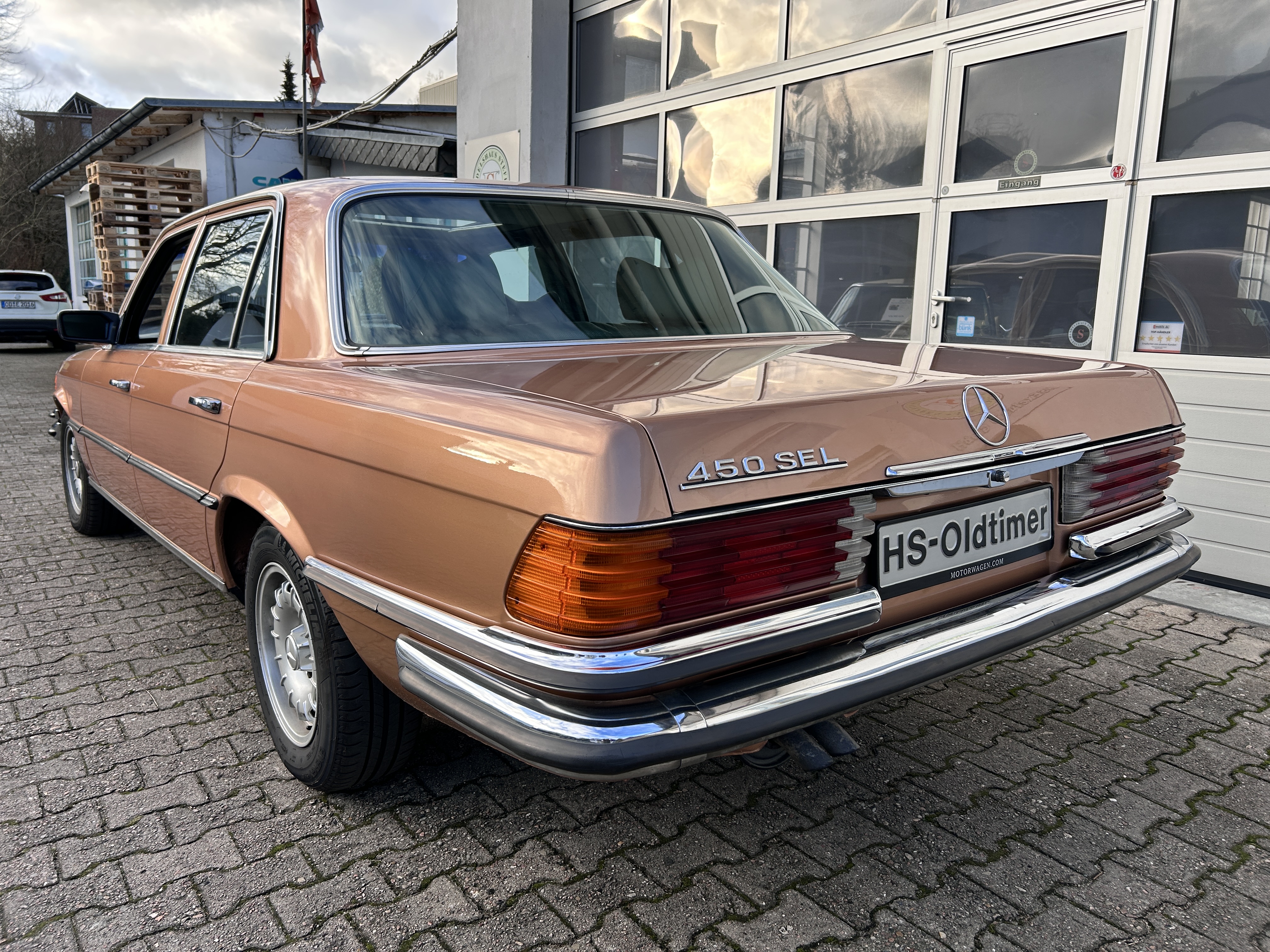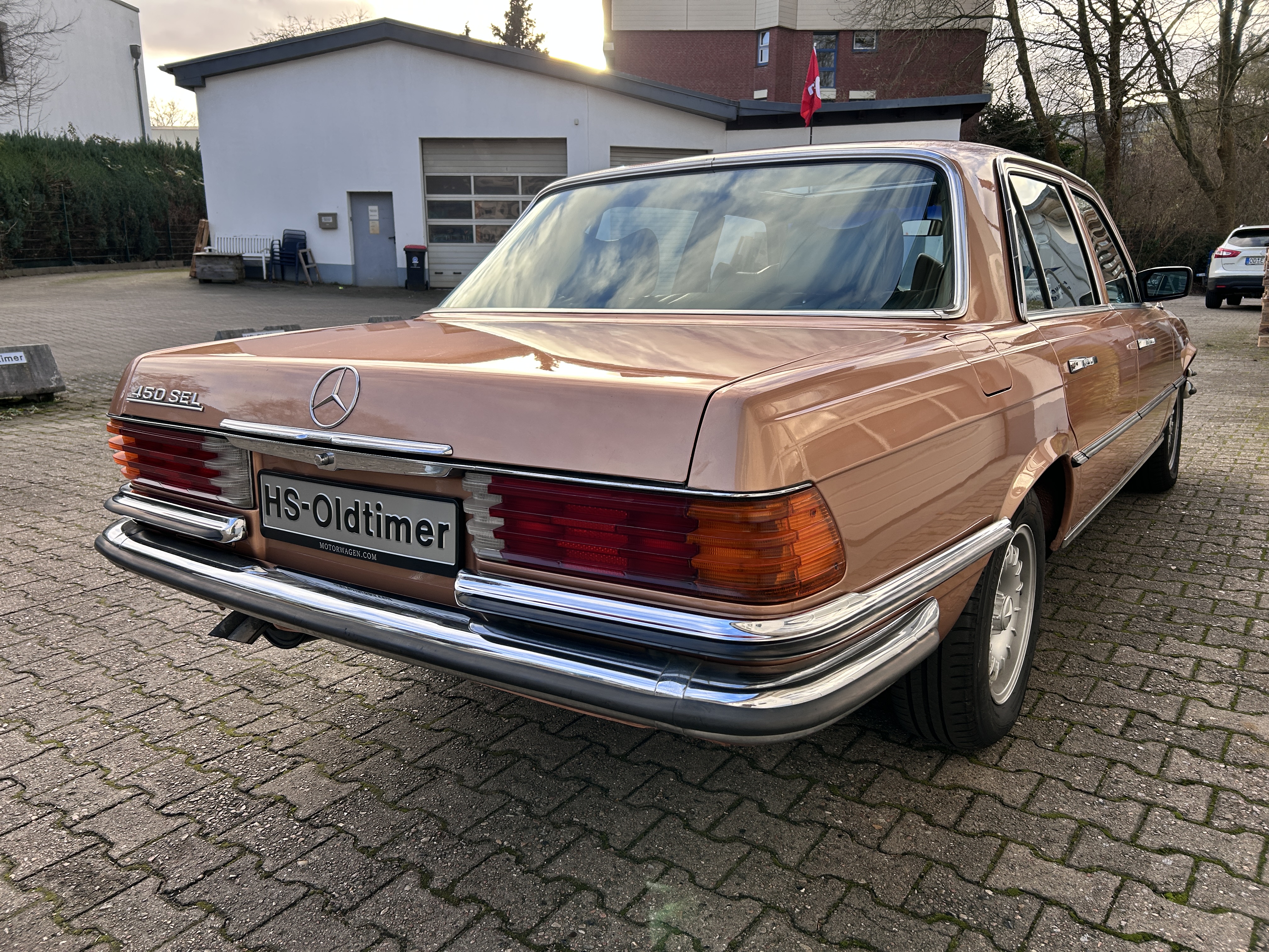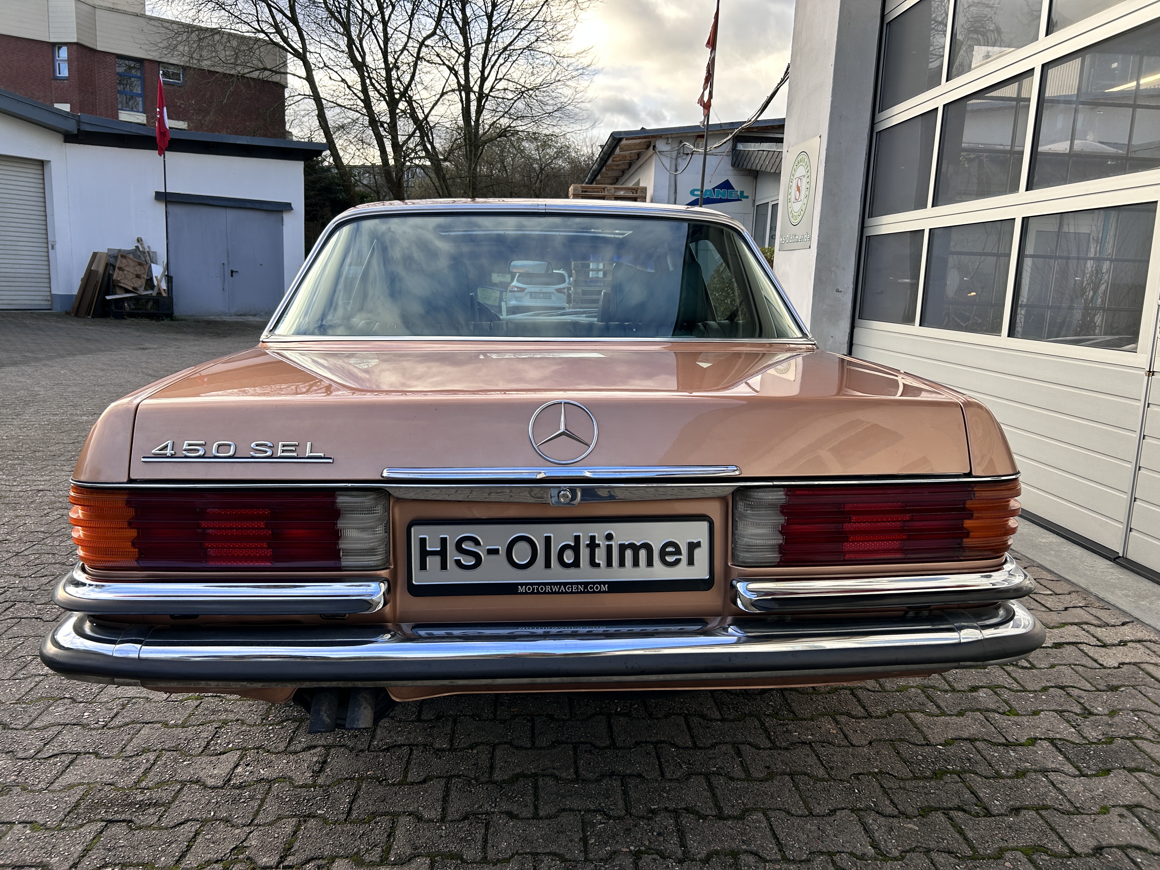 Ein 450 SEL in besonders schöner Farbkombination. Byzanzgold Metallic, Leder dunkelgrün. Mit Schiebedach. Viele große Rechnungen vorhanden. Ab 2015 wurde hier nach längerer Standzeit sehr viel gemacht (Ca. 13.000 Euro)! Einige TÜV-Belege und alte Fg.- Briefe sind auch noch mit dabei. Dieser 450er fährt sich phantastisch. Motor läuft sehr schön und das Getriebe schaltet sauber hoch. Wer einen richtig guten Mercedes 450 SEL sucht, sollte sich diesen auf jeden Fall einmal anschauen, es lohnt sich wie immer bei uns. Wir freuen uns auf Ihren Anruf und Besuch. Weitere Infos und schöne Oldtimer finden Sie auf unserer eigenen Homepage: www.hs-oldtimer.de