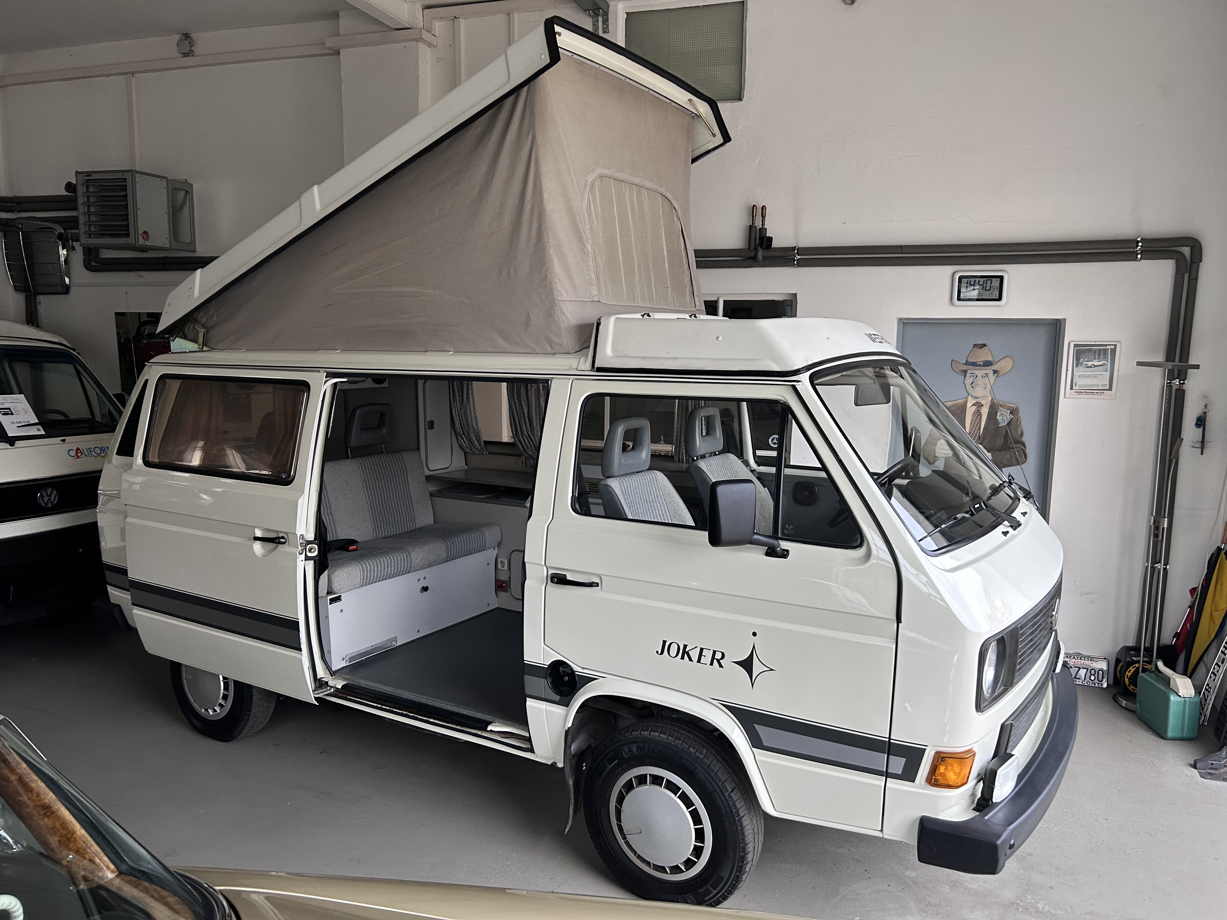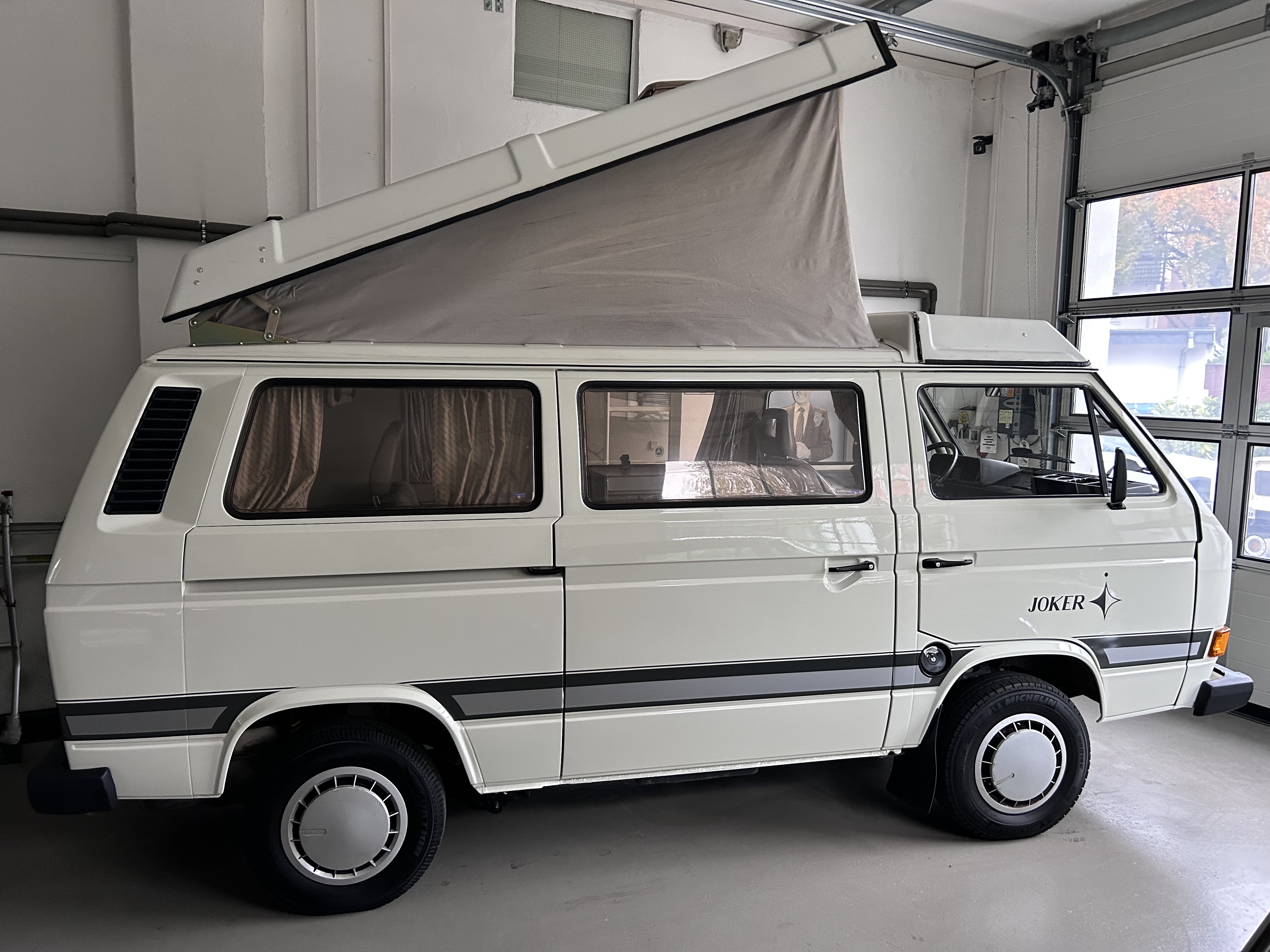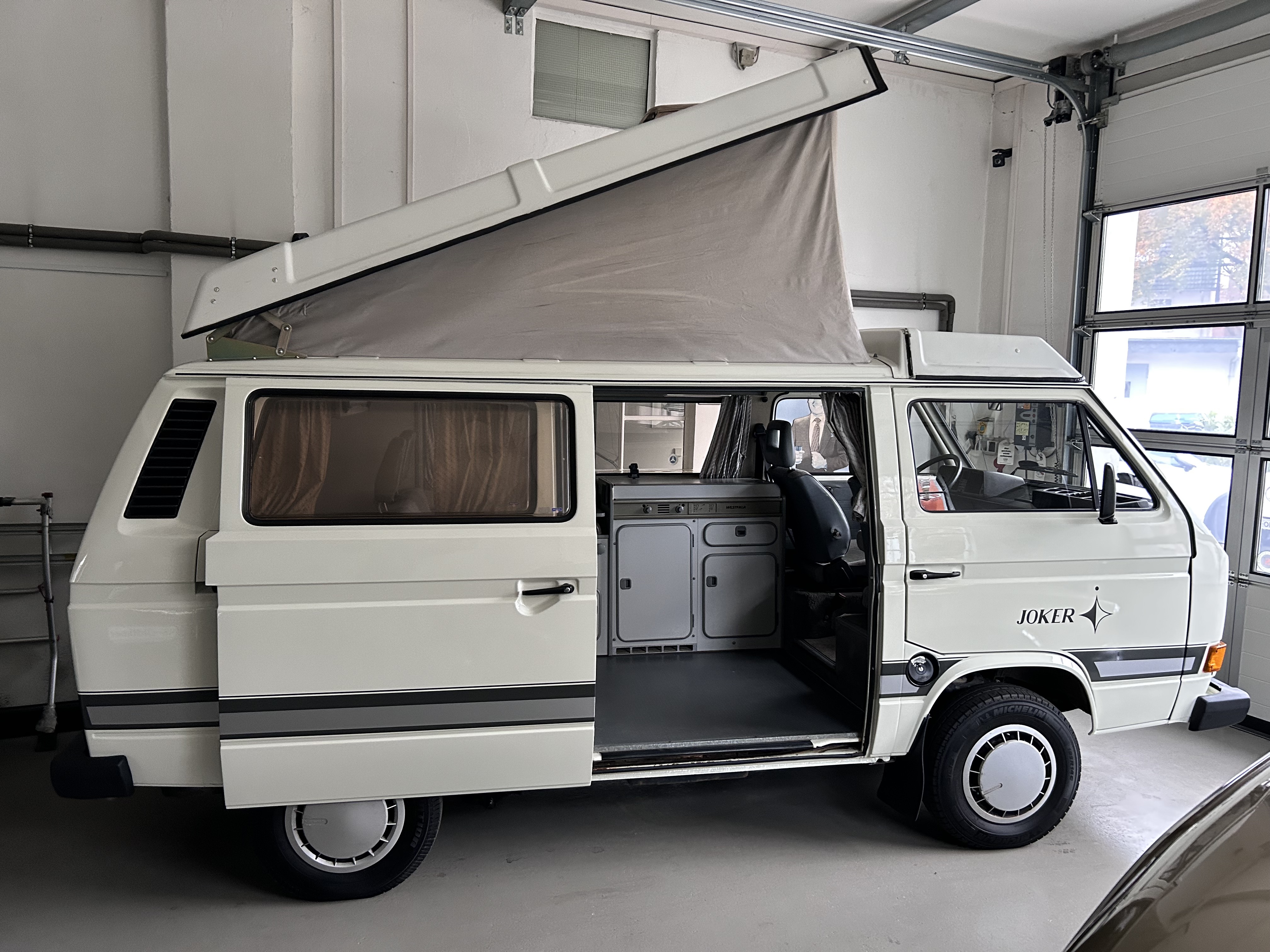 Gepflegter T3 als Joker mit Aufstelldach von Westfalia. Sagenhafte Blechsubstanz, der Bulli kommt aus Spanien. Die TÜV und H-Abnahme inkl. einer Inspektion und Zahnriemen, einige Gummis, Reifen etc., hier wurden einiges gemacht. Der T3 fährt phantastisch. Wer einen guten und gesunden T3 sucht, sollte sich diesen auf jeden Fall einmal anschauen, es lohnt sich wie immer bei uns. Wir freuen uns auf Ihren Anruf und Besuch. Weitere Infos und schöne Oldtimer finden Sie auf unserer eigenen Homepage: www.hs-oldtimer.de