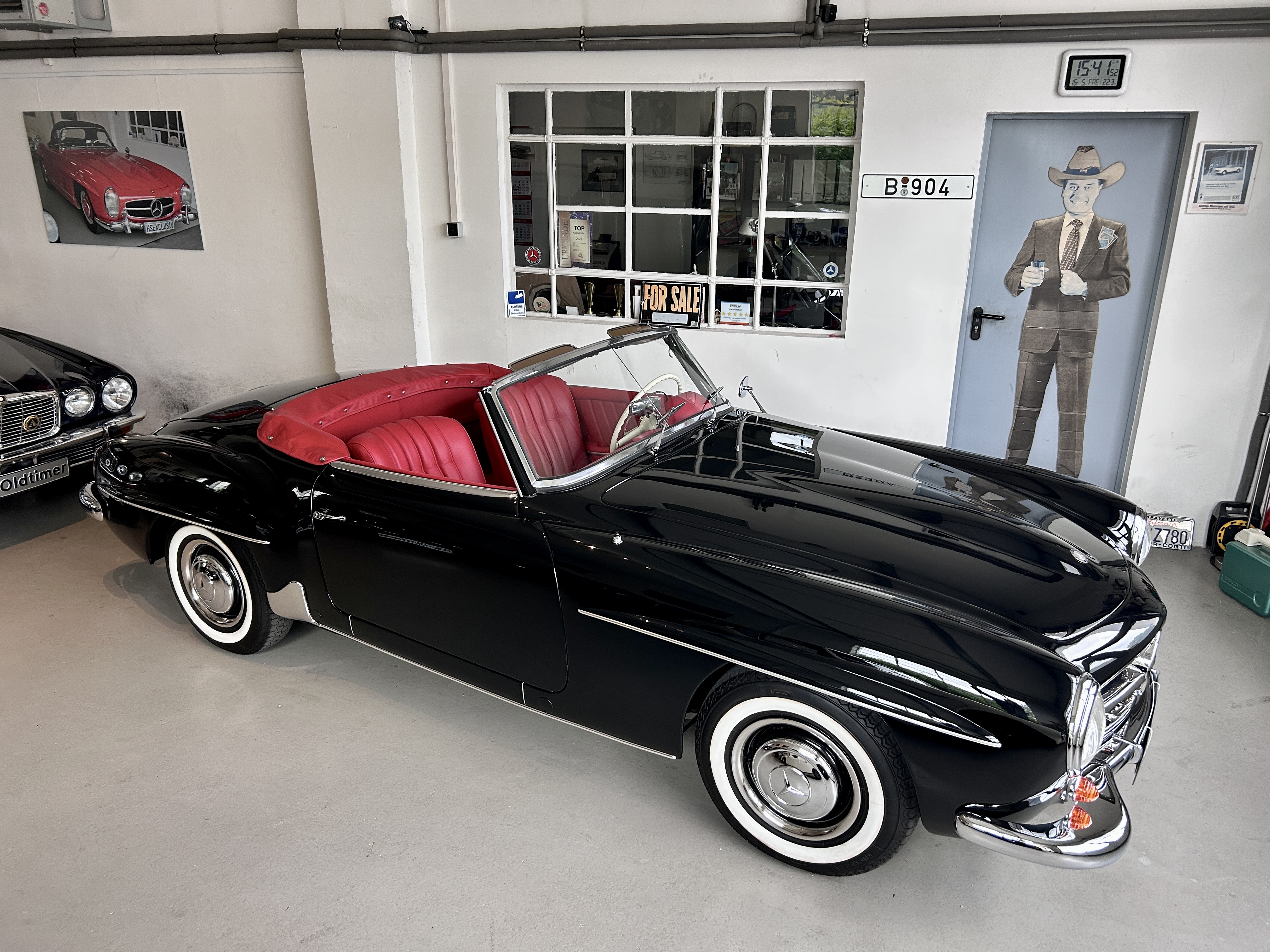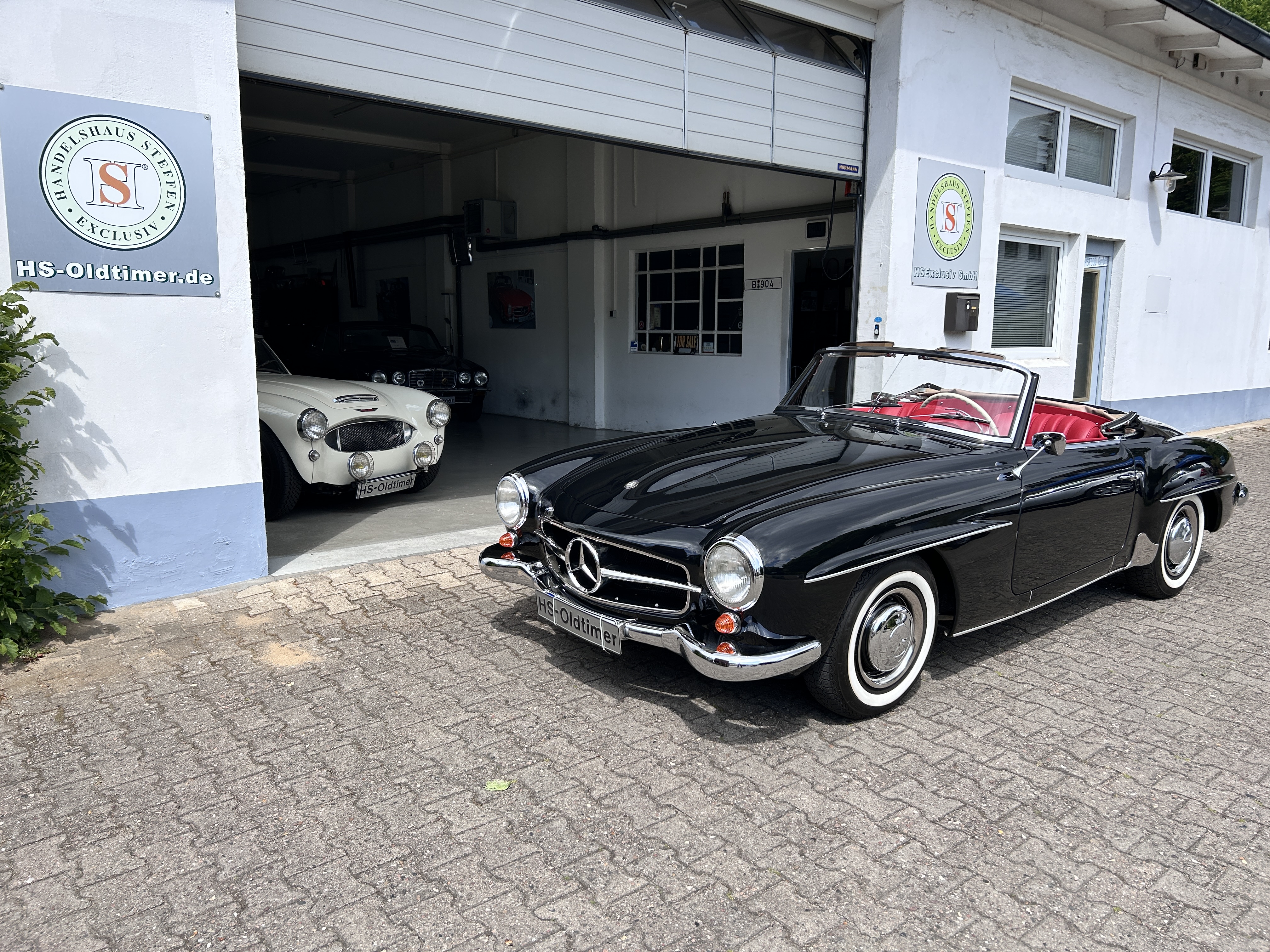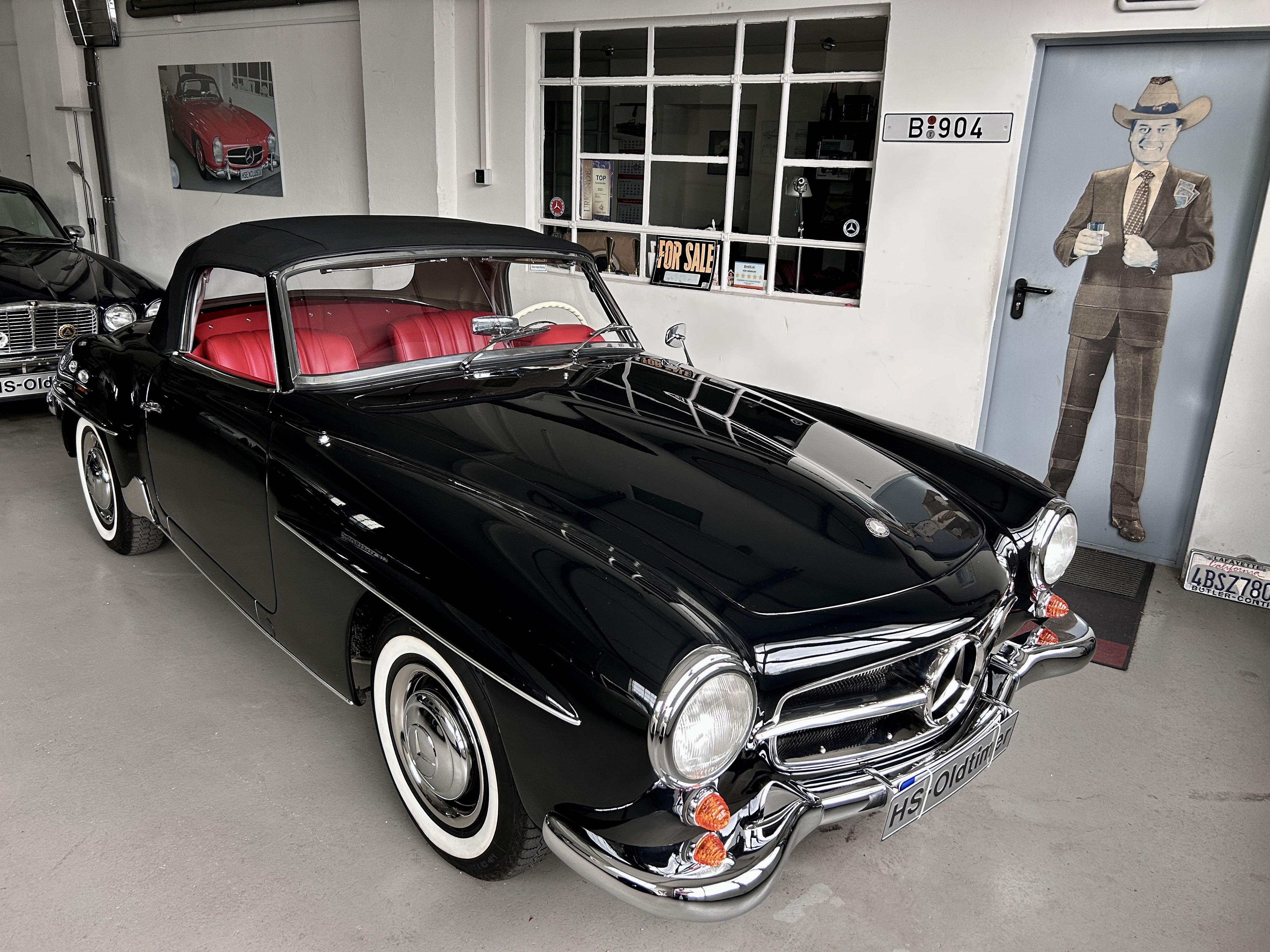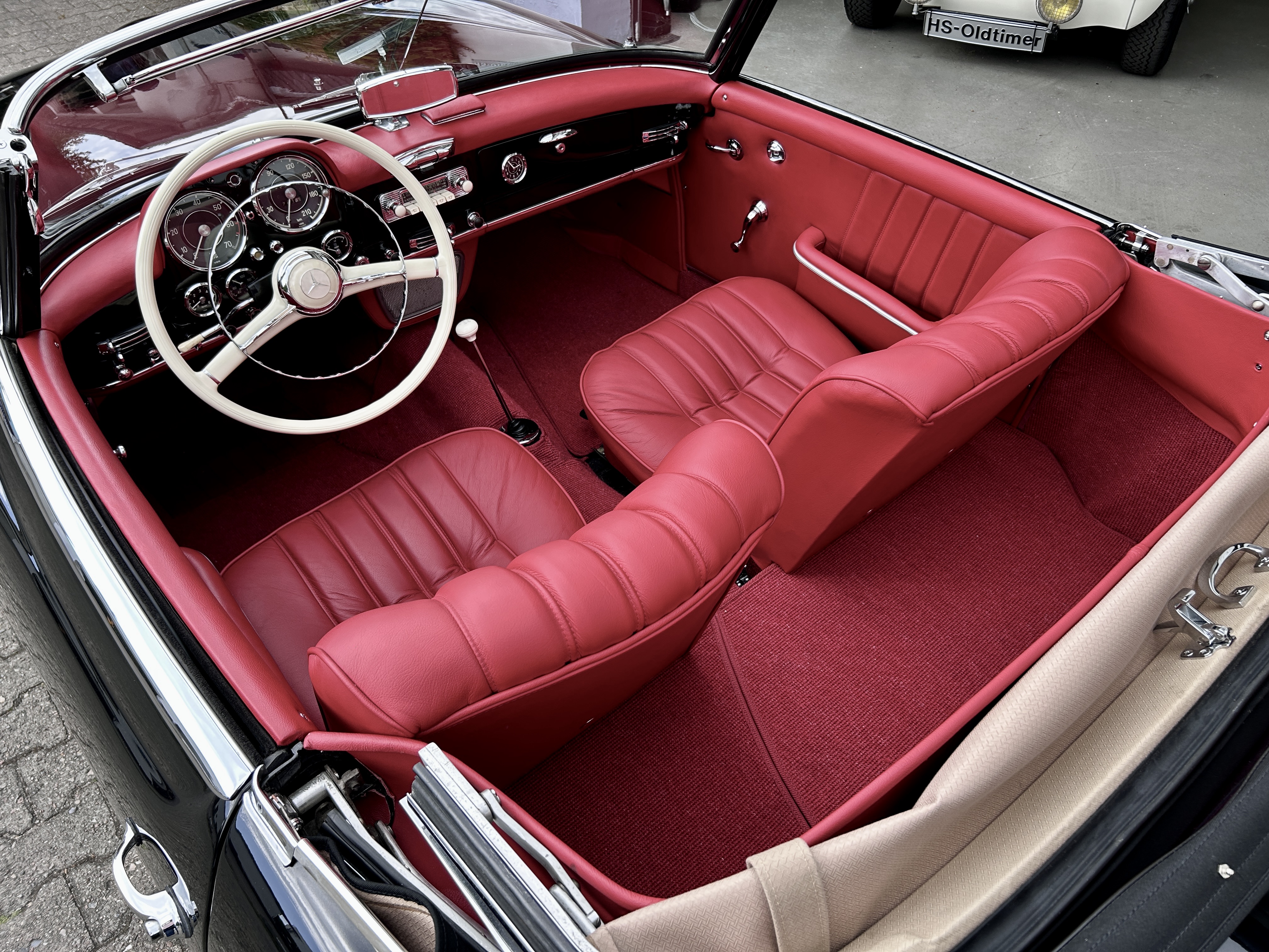 Dieser aufwendig restaurierte 190 SL ist in einem sehr guten Zustand. Meiner Meinung nach die schönste Farbkombination für dieses Auto und auch berühmt geworden durch Rosemarie Nitribitt, die den SL genau so gefahren hat (Im Film leider falsch dargestellt, in Rot / Rot). Es gibt einen dicken Ordner mit Unterlagen; Rechnungen, TÜV-Belegen, einem alten Kfz Brief und vieles mehr. Der Kunde hat auch ein Gutachten mitgeliefert über 162.000 Euro, mit der Zustandsnote 1-. Das Auto fährt sich phantastisch. Der Motor läuft sehr schön und das Getriebe lässt sich sauber schalten. Wer den Besten 190 SL sucht, sollte sich diesen auf jeden Fall einmal anschauen, es lohnt sich wie immer bei uns. Wir freuen uns auf Ihren Anruf und Besuch. Weitere Infos und schöne Oldtimer finden Sie auf unserer eigenen Homepage: www.hs-oldtimer.de