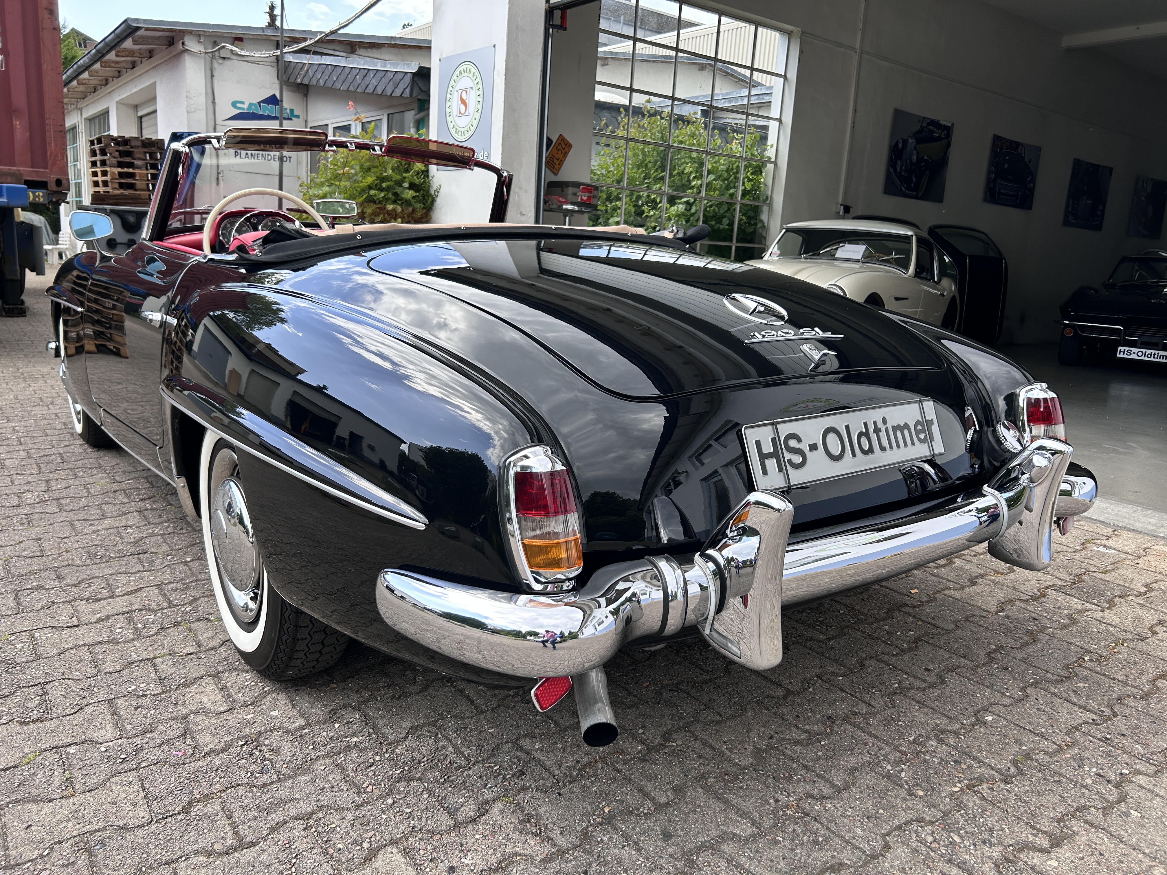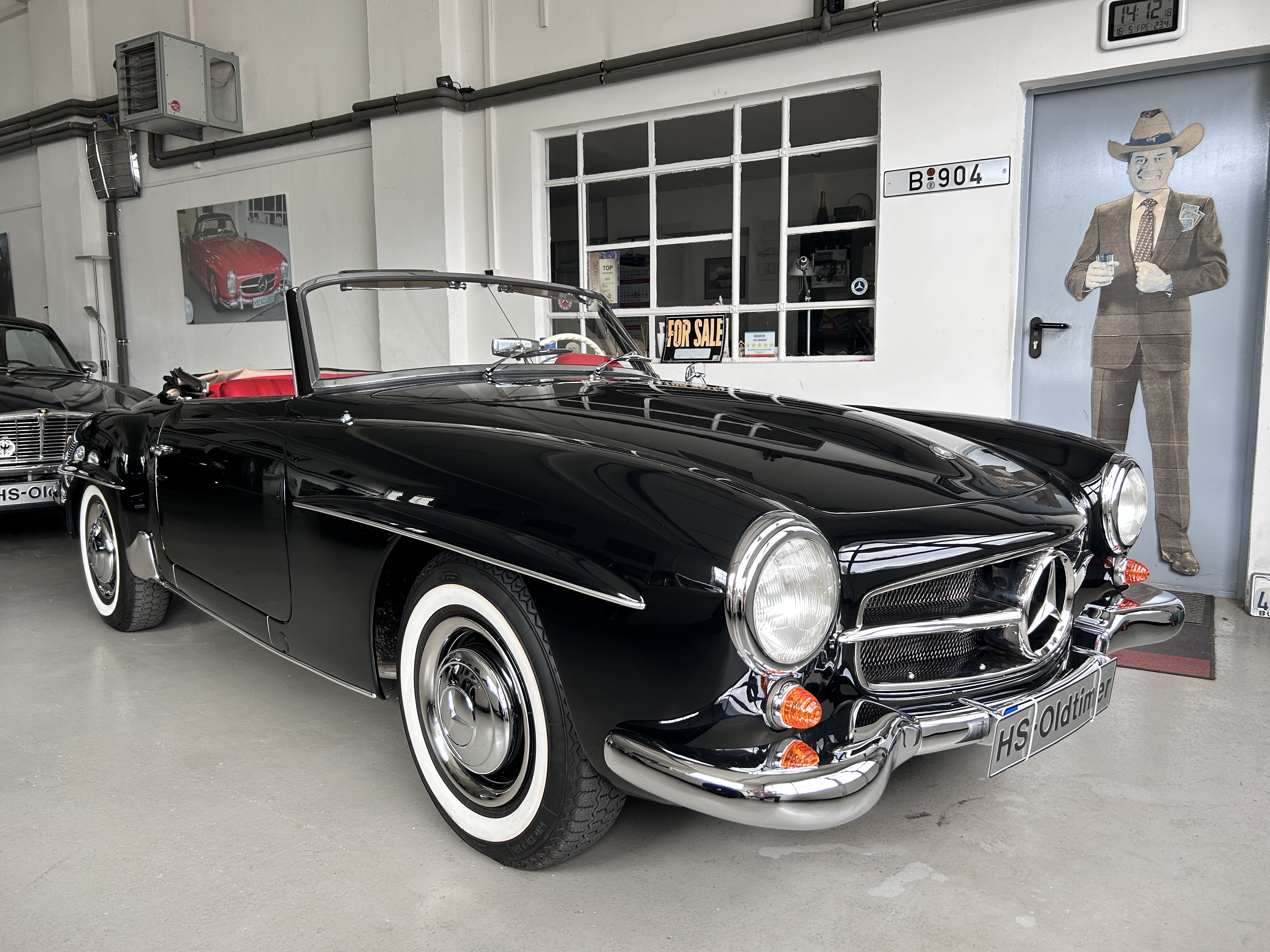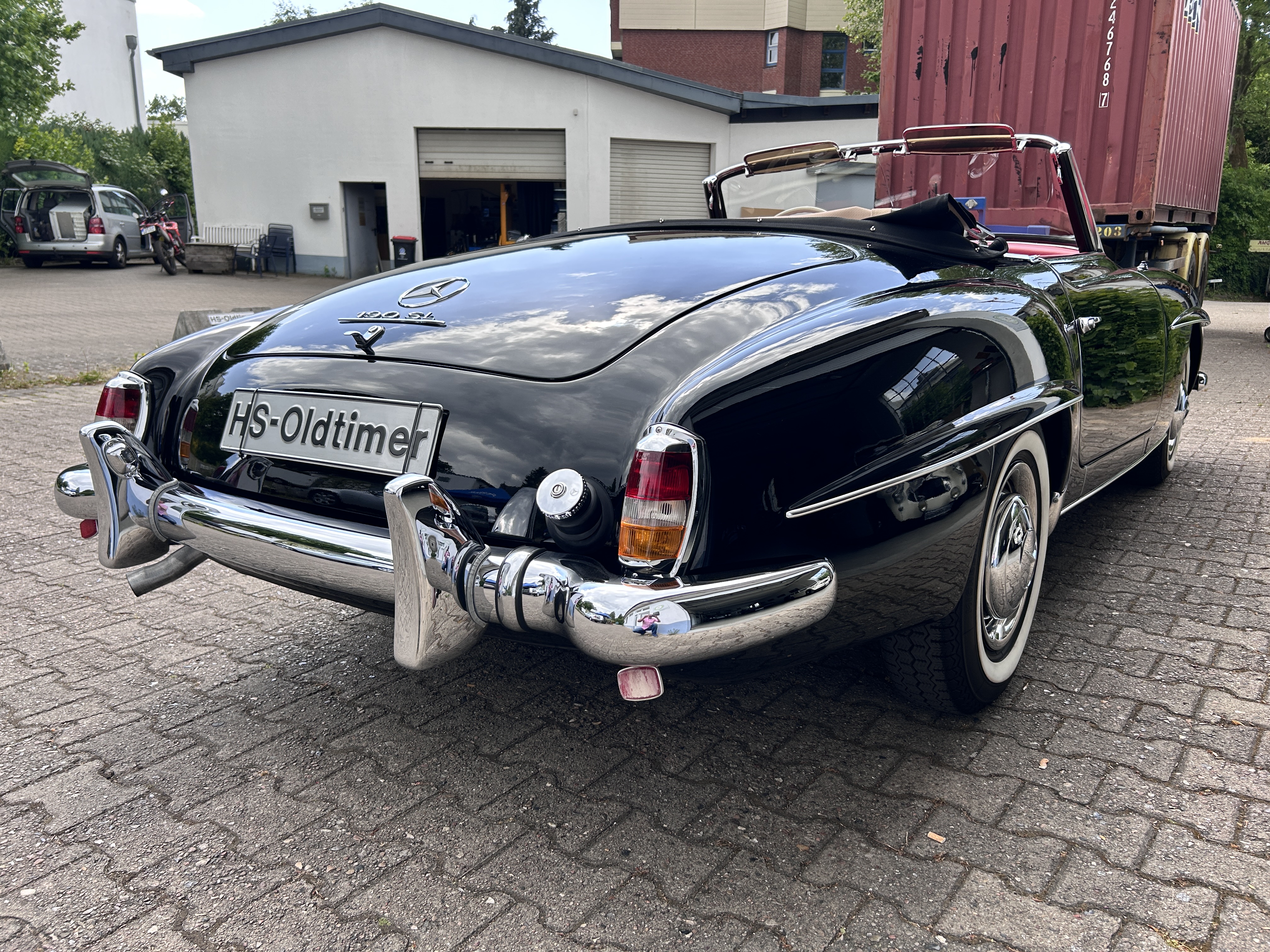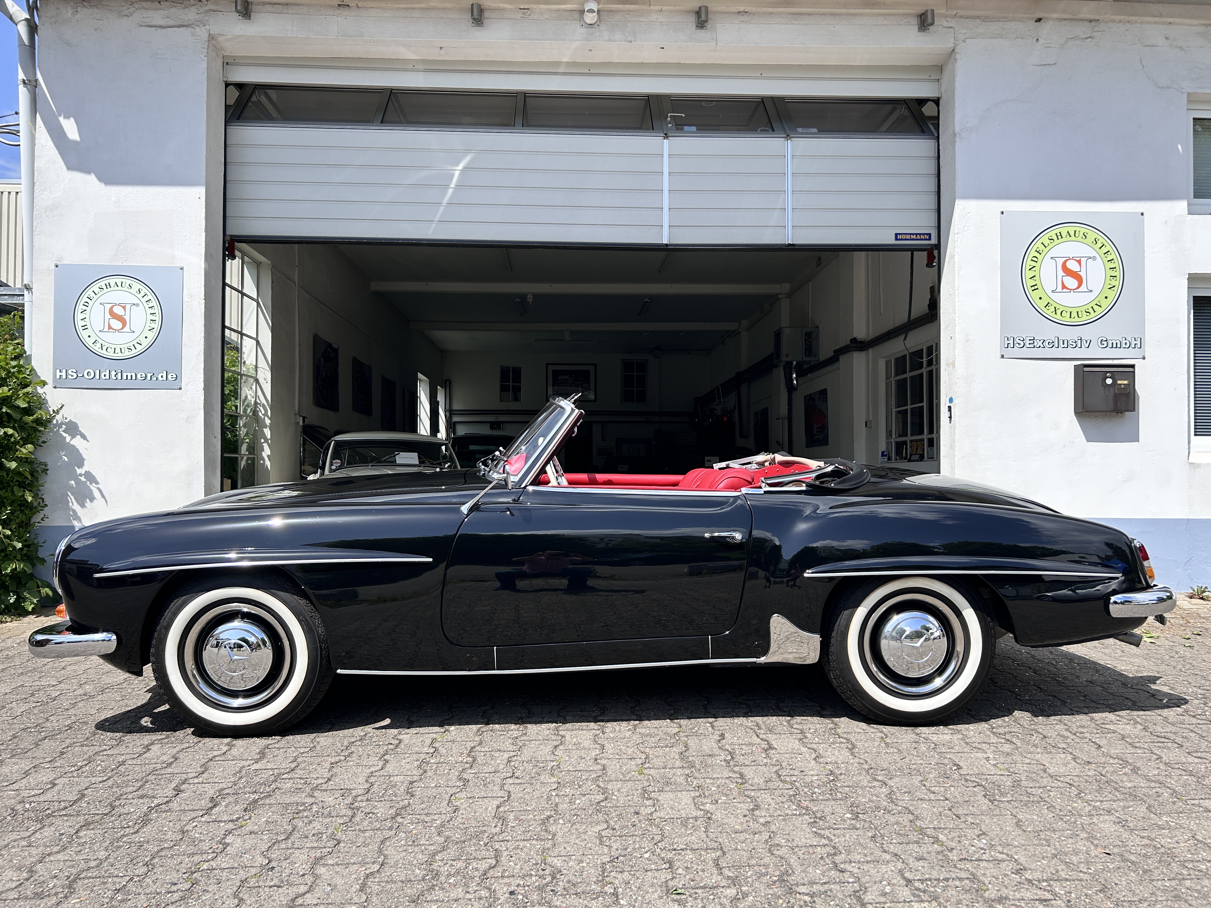 Dieser aufwendig restaurierte 190 SL ist in einem sehr guten Zustand. Meiner Meinung nach die schönste Farbkombination für dieses Auto und auch berühmt geworden durch Rosemarie Nitribitt, die den SL genau so gefahren hat (Im Film leider falsch dargestellt, in Rot / Rot). Es gibt einen dicken Ordner mit Unterlagen; Rechnungen, TÜV-Belegen, einem alten Kfz Brief und vieles mehr. Der Kunde hat auch ein Gutachten mitgeliefert über 162.000 Euro, mit der Zustandsnote 1-. Das Auto fährt sich phantastisch. Der Motor läuft sehr schön und das Getriebe lässt sich sauber schalten. Wer den Besten 190 SL sucht, sollte sich diesen auf jeden Fall einmal anschauen, es lohnt sich wie immer bei uns. Wir freuen uns auf Ihren Anruf und Besuch. Weitere Infos und schöne Oldtimer finden Sie auf unserer eigenen Homepage: www.hs-oldtimer.de