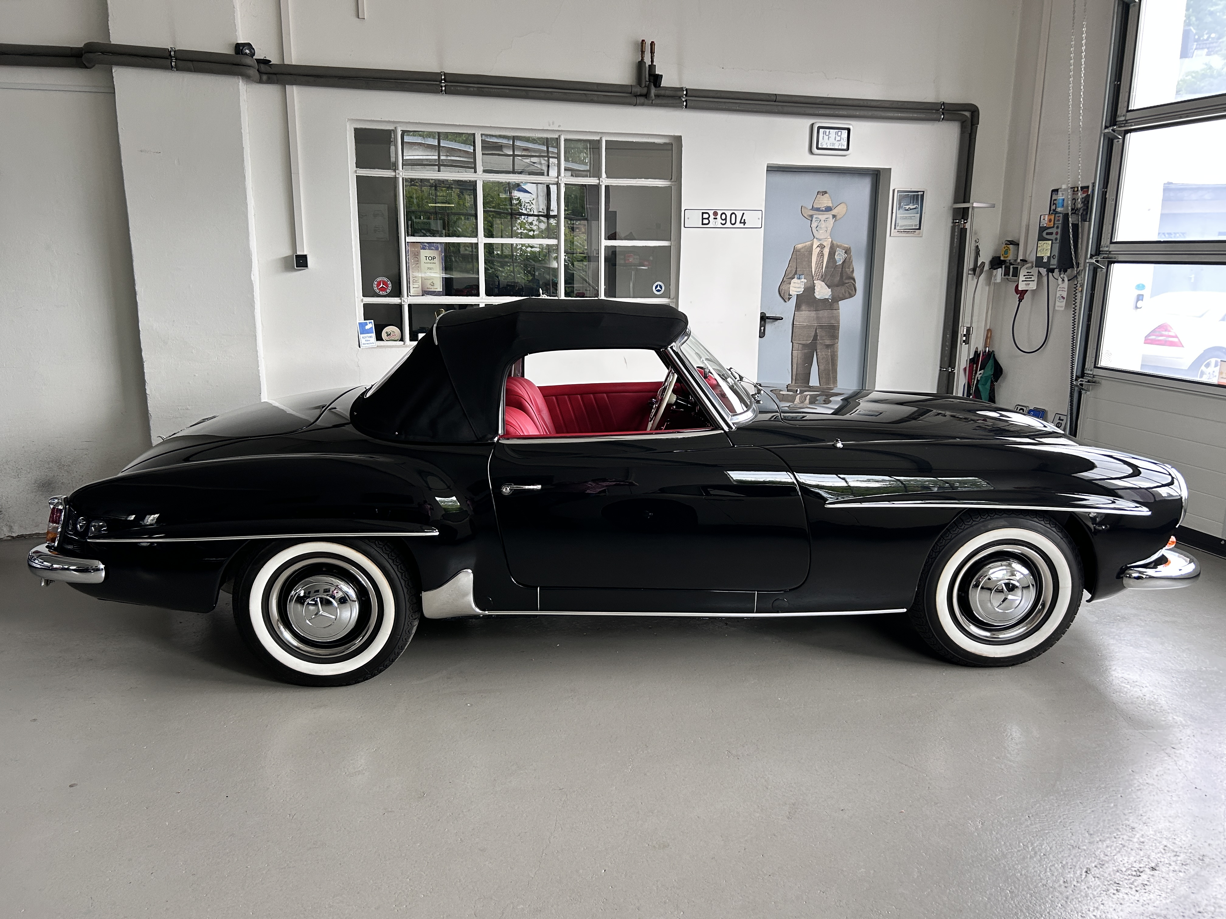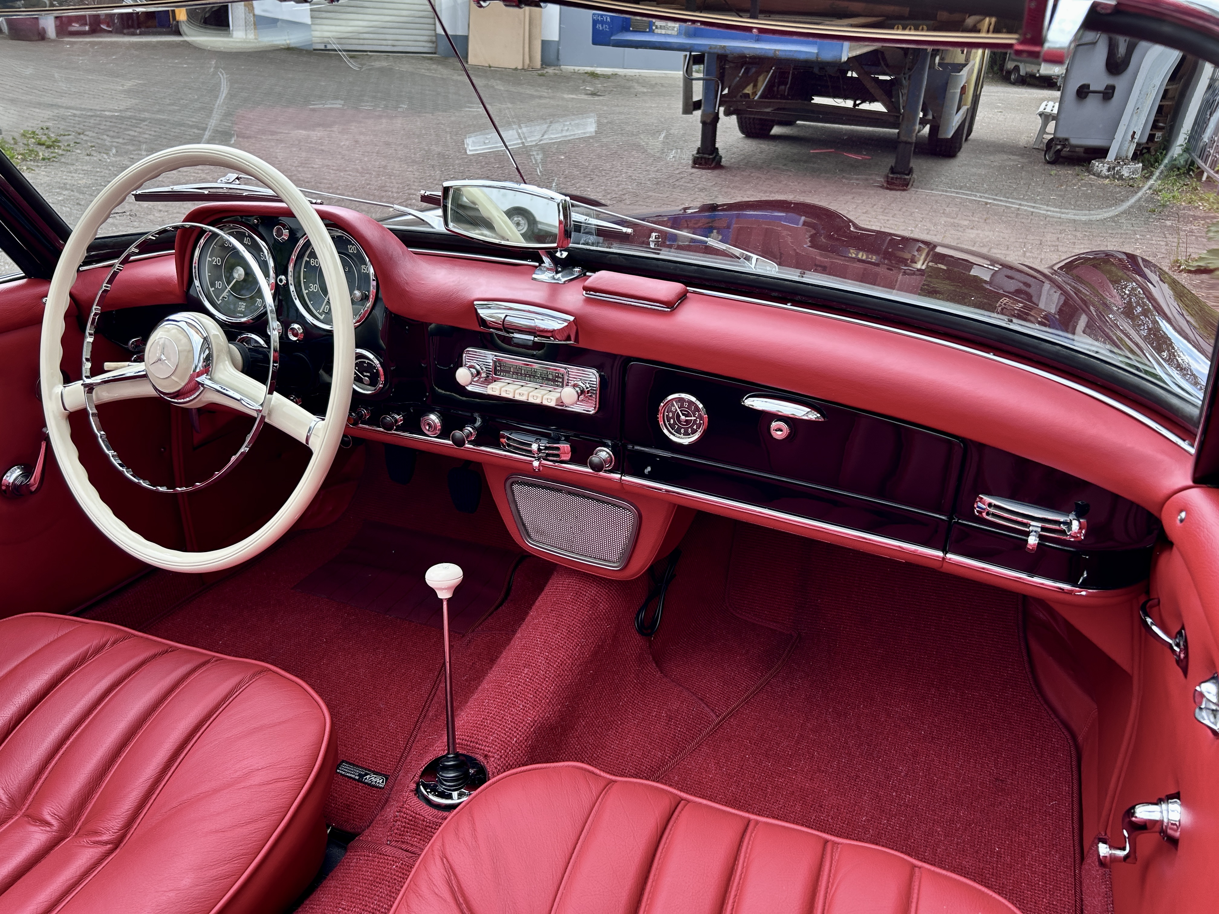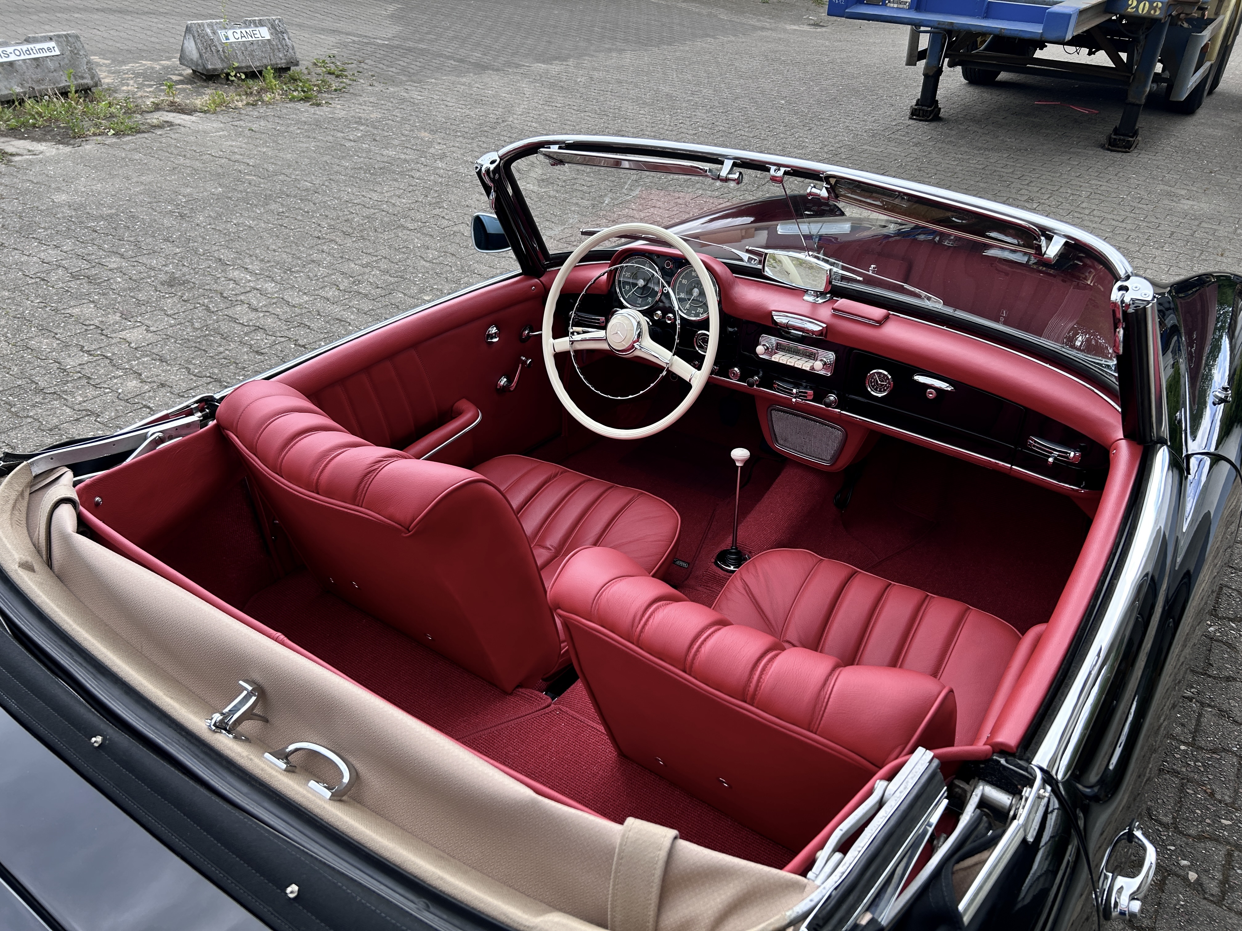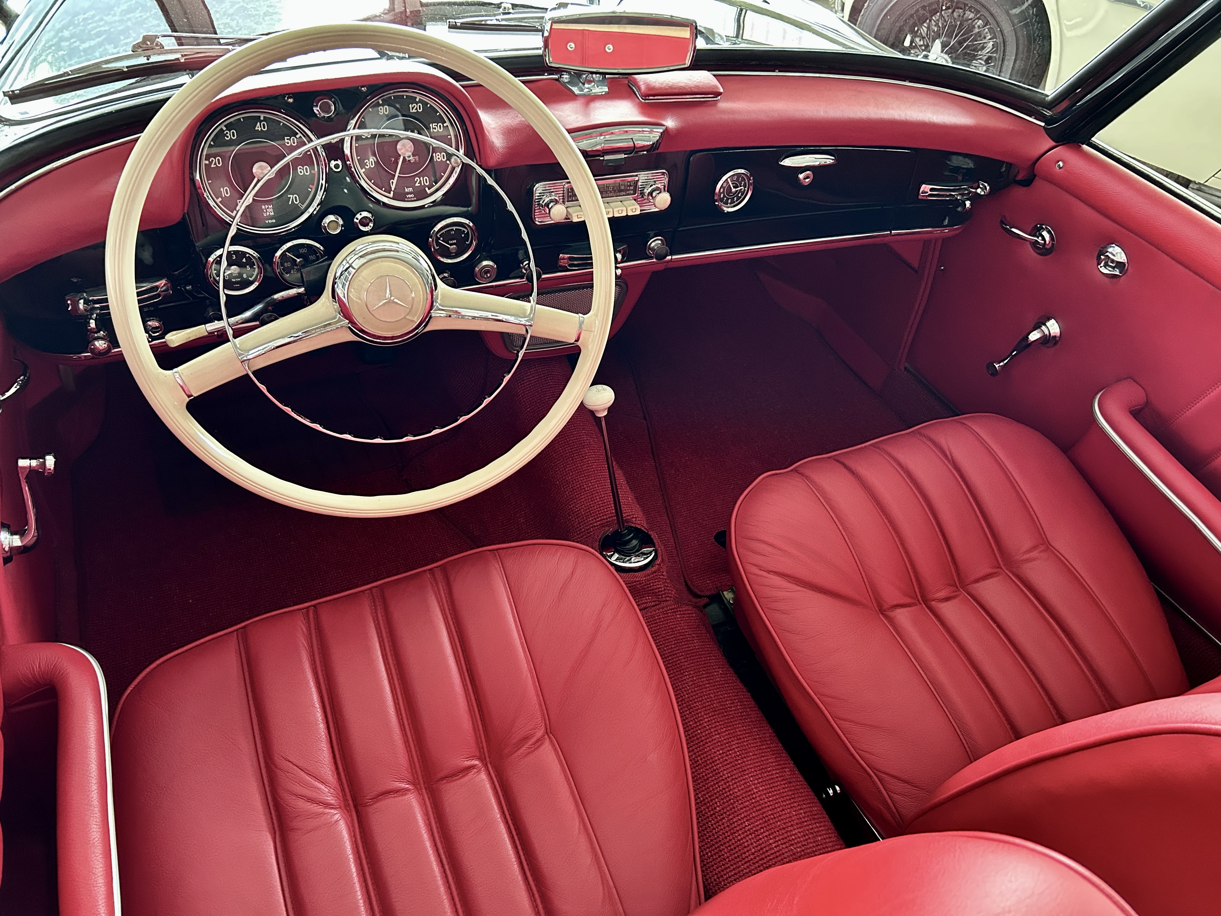 Dieser aufwendig restaurierte 190 SL ist in einem sehr guten Zustand. Meiner Meinung nach die schönste Farbkombination für dieses Auto und auch berühmt geworden durch Rosemarie Nitribitt, die den SL genau so gefahren hat (Im Film leider falsch dargestellt, in Rot / Rot). Es gibt einen dicken Ordner mit Unterlagen; Rechnungen, TÜV-Belegen, einem alten Kfz Brief und vieles mehr. Der Kunde hat auch ein Gutachten mitgeliefert über 162.000 Euro, mit der Zustandsnote 1-. Das Auto fährt sich phantastisch. Der Motor läuft sehr schön und das Getriebe lässt sich sauber schalten. Wer den Besten 190 SL sucht, sollte sich diesen auf jeden Fall einmal anschauen, es lohnt sich wie immer bei uns. Wir freuen uns auf Ihren Anruf und Besuch. Weitere Infos und schöne Oldtimer finden Sie auf unserer eigenen Homepage: www.hs-oldtimer.de