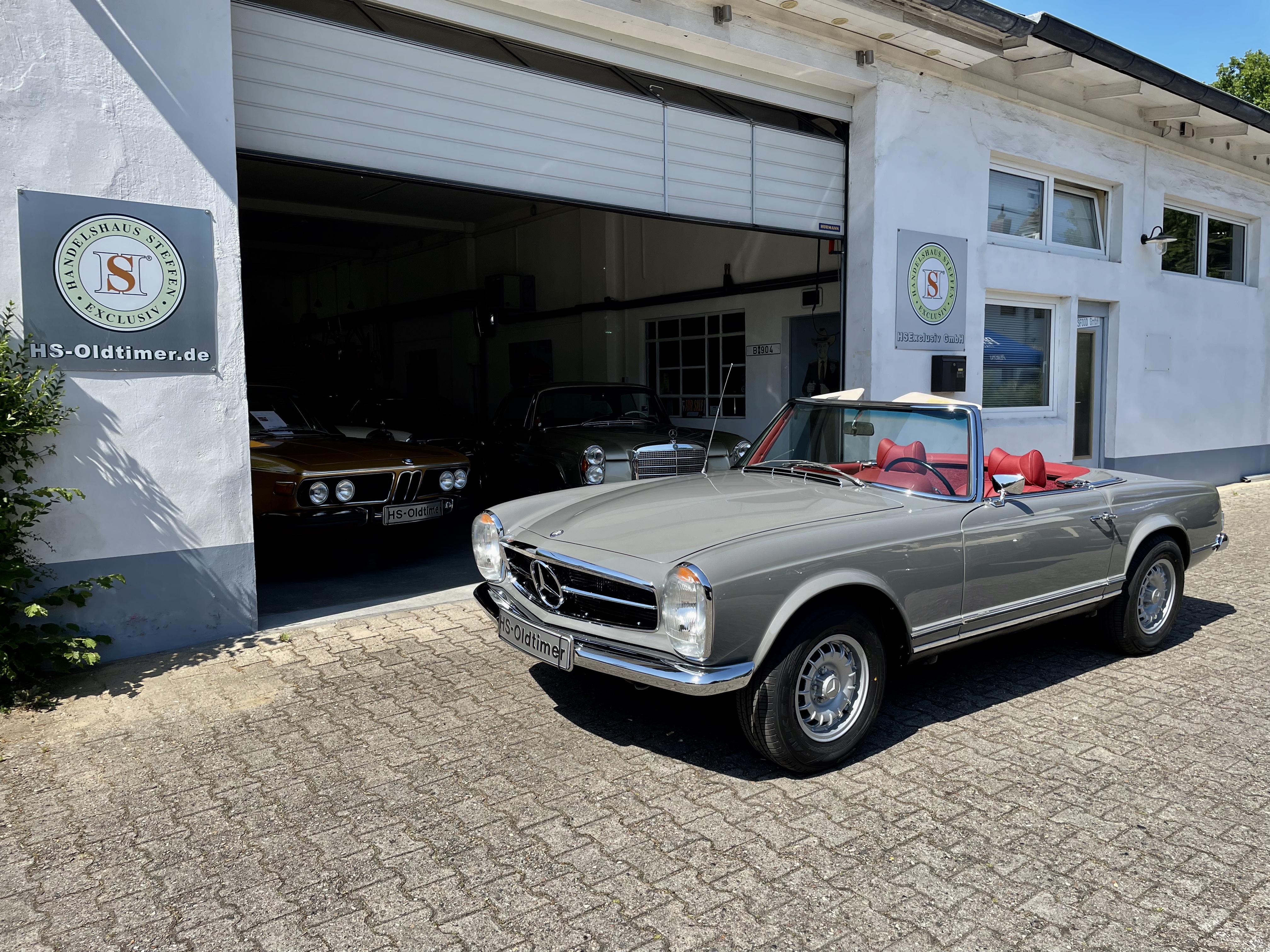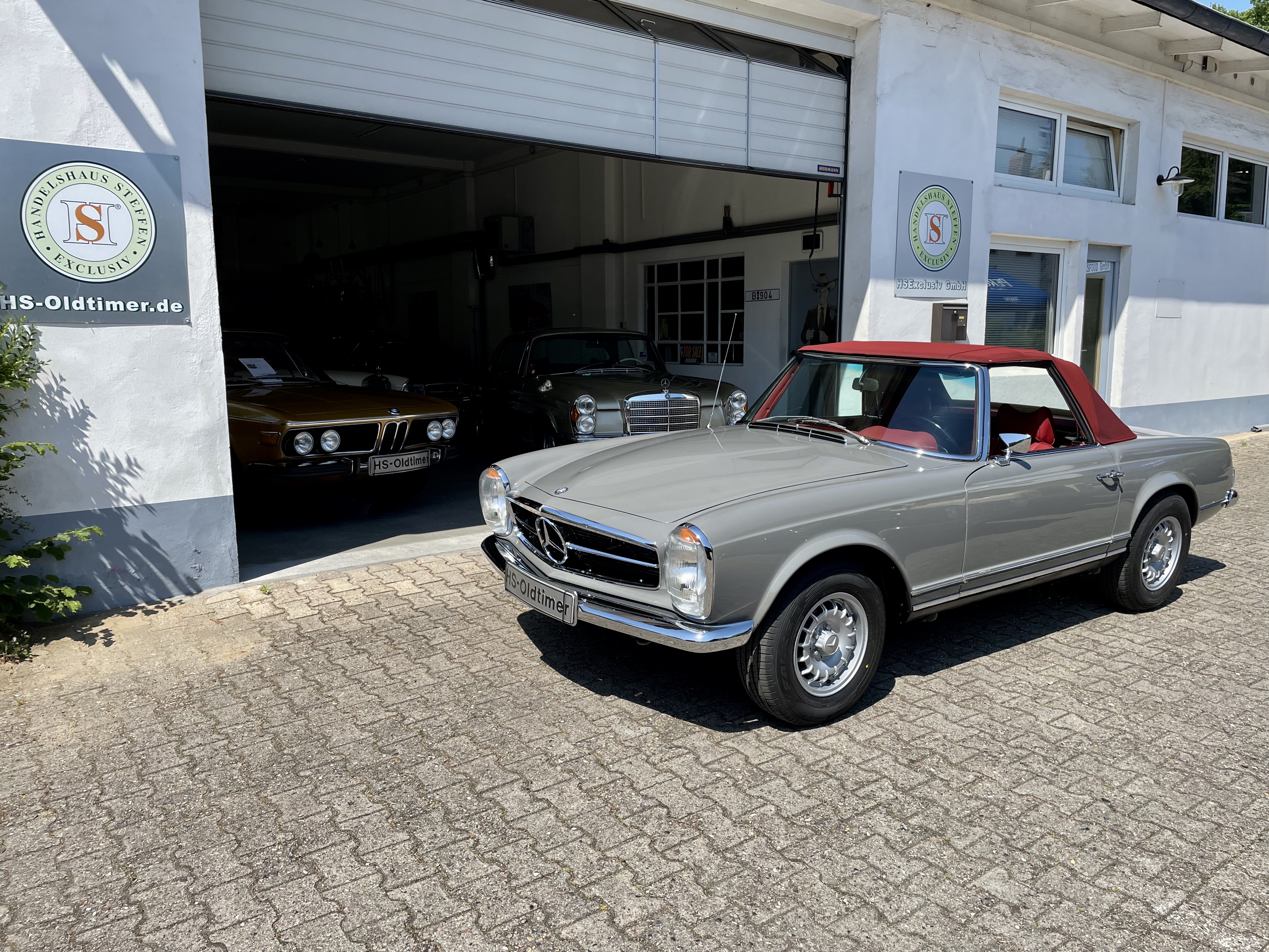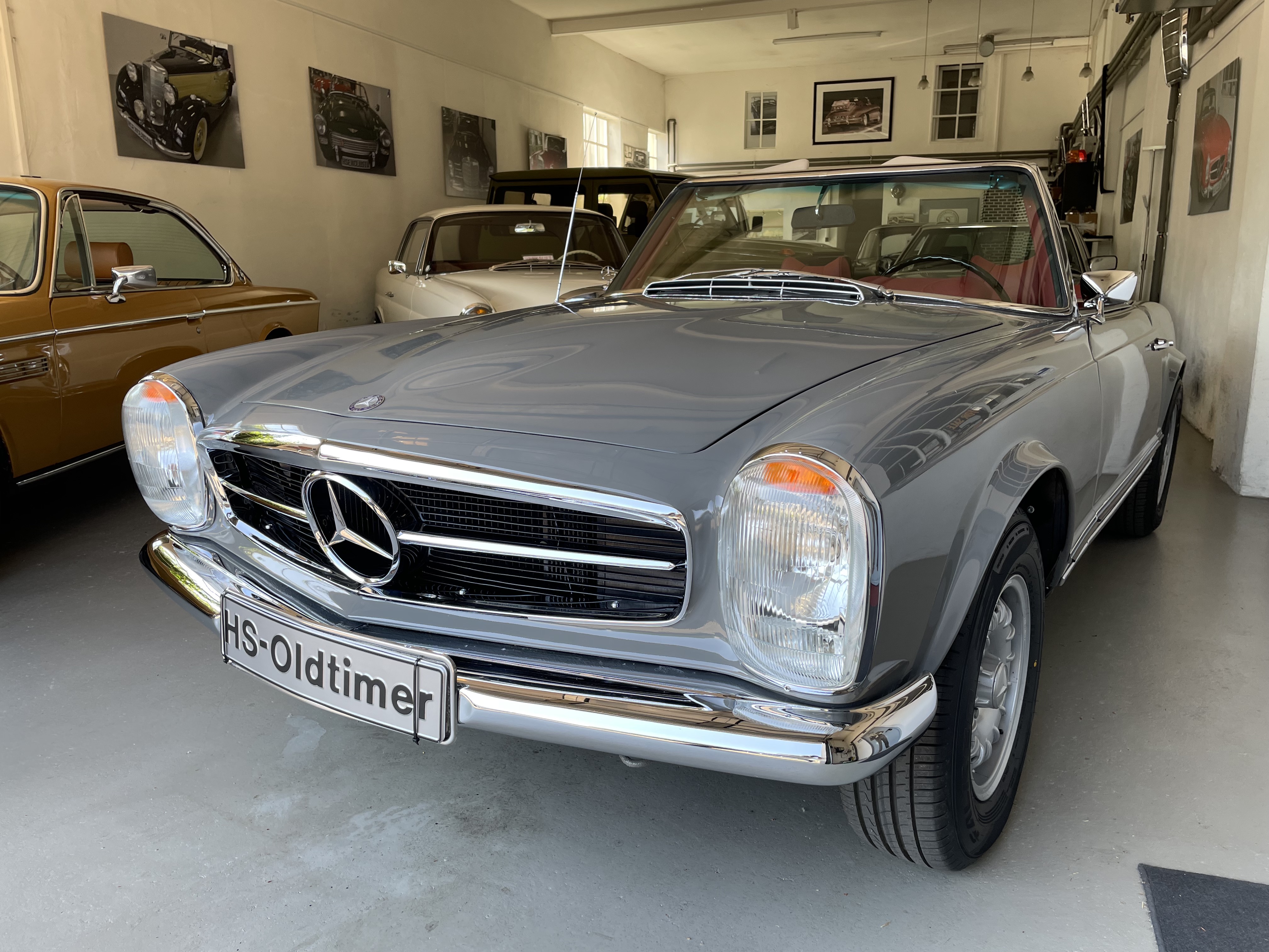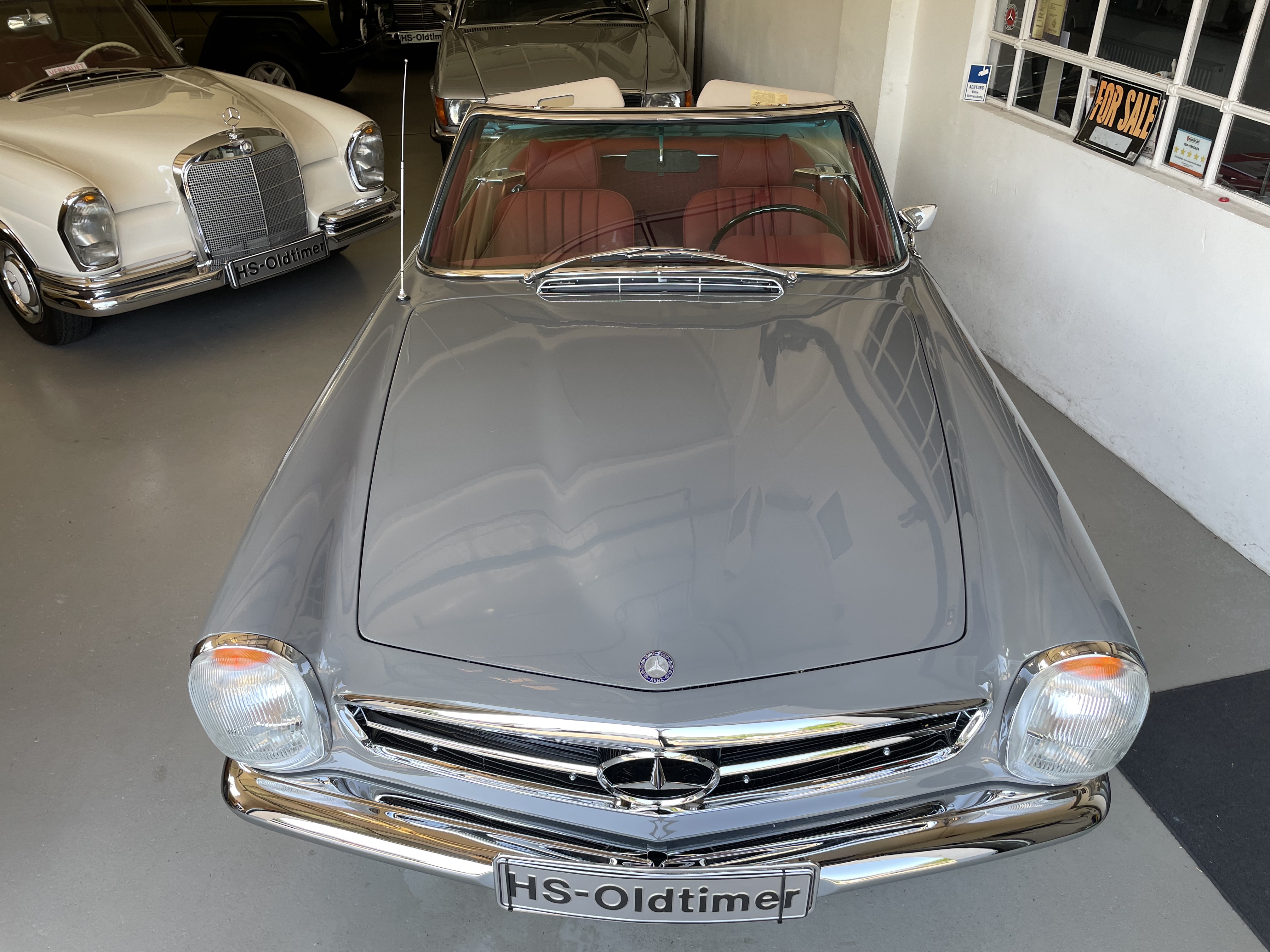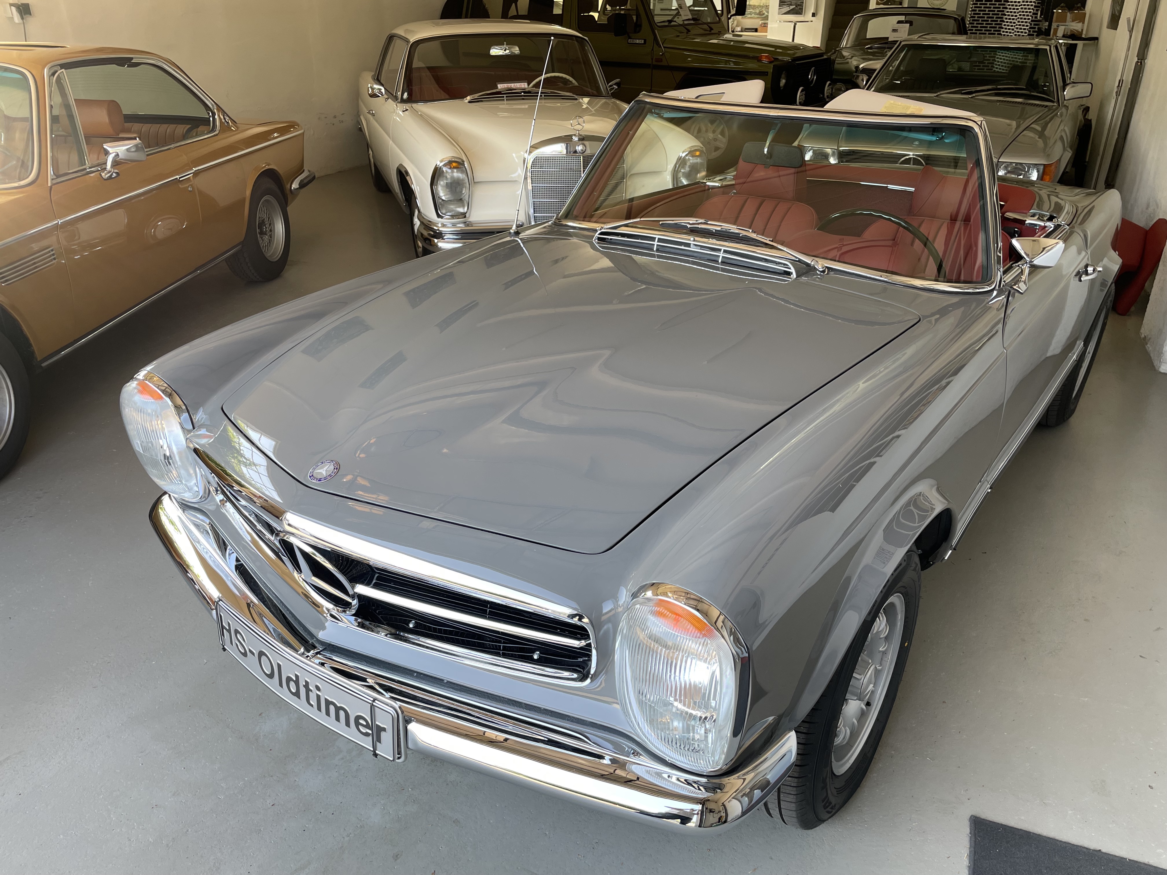Diese Pagode ist aufwendig restauriert worden. TÜV und H-Abnahme sind natürlich gemacht. Deutscher Brief ist vorhanden. Original Farbgebung: Die Außenfarbe ist 124 G arabergrau und das Hardtop ist 173 G anthrazitgrau. Fährt sich phantastisch. Schon 800 Kilometer nach Fertigstellung gefahren, jetzt passt alles. Wer eine besonders schöne 280 SL Pagode sucht, sollte sich diese auf jeden Fall einmal anschauen, es lohnt sich wie immer bei uns. Wir freuen uns auf Ihren Anruf und Besuch. Weitere Infos und schöne Oldtimer finden Sie auf unserer eigenen Homepage: www.hs-oldtimer.de