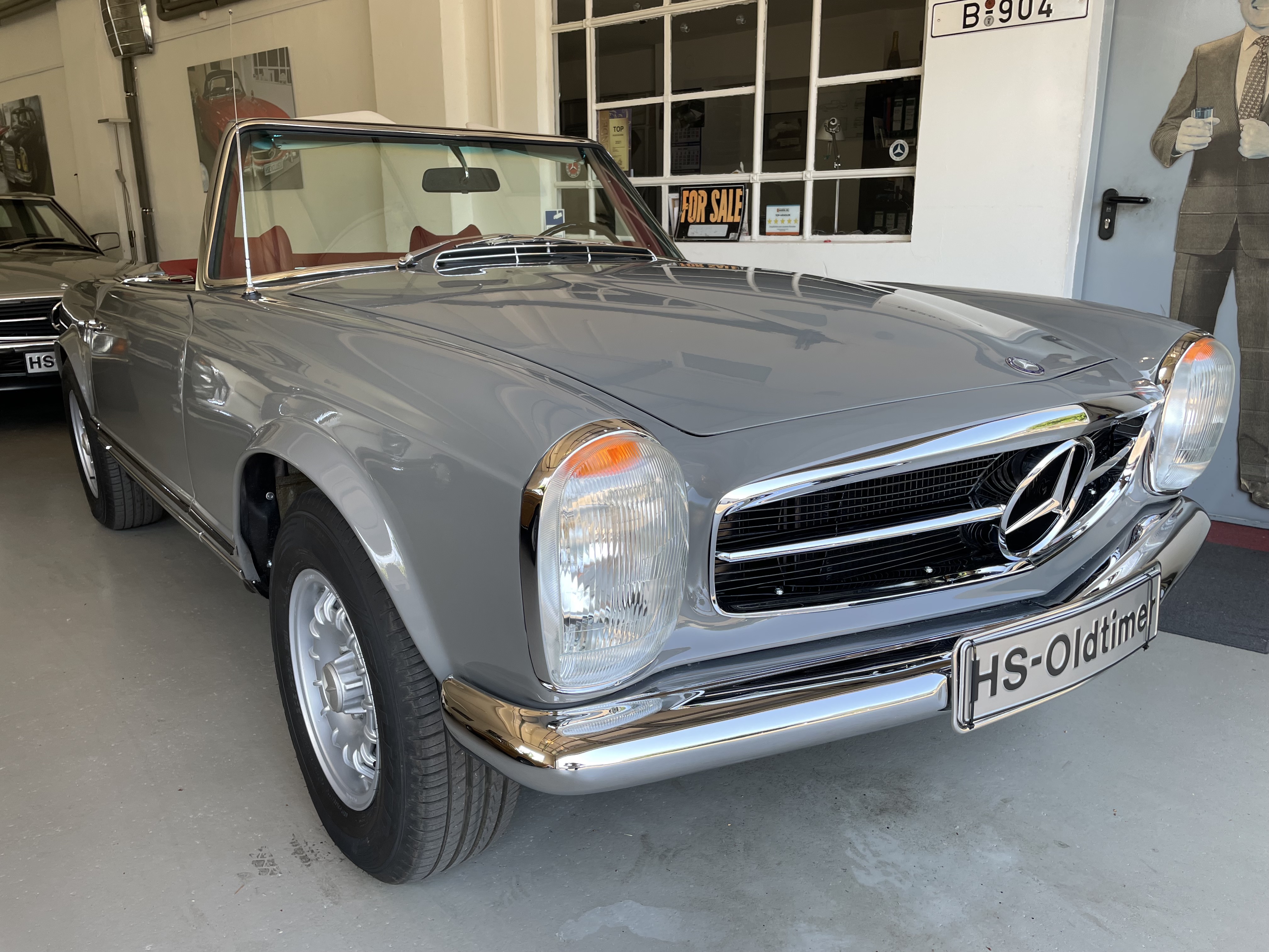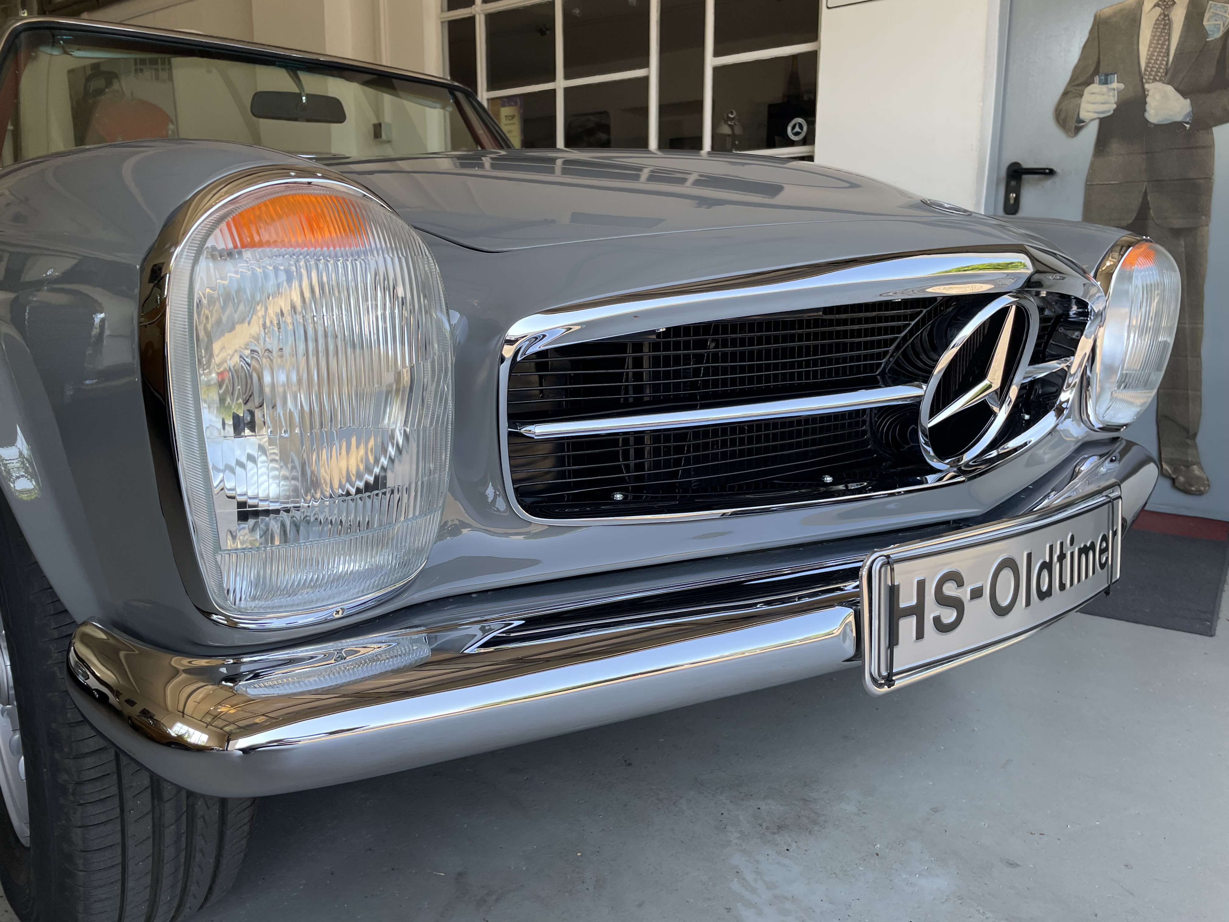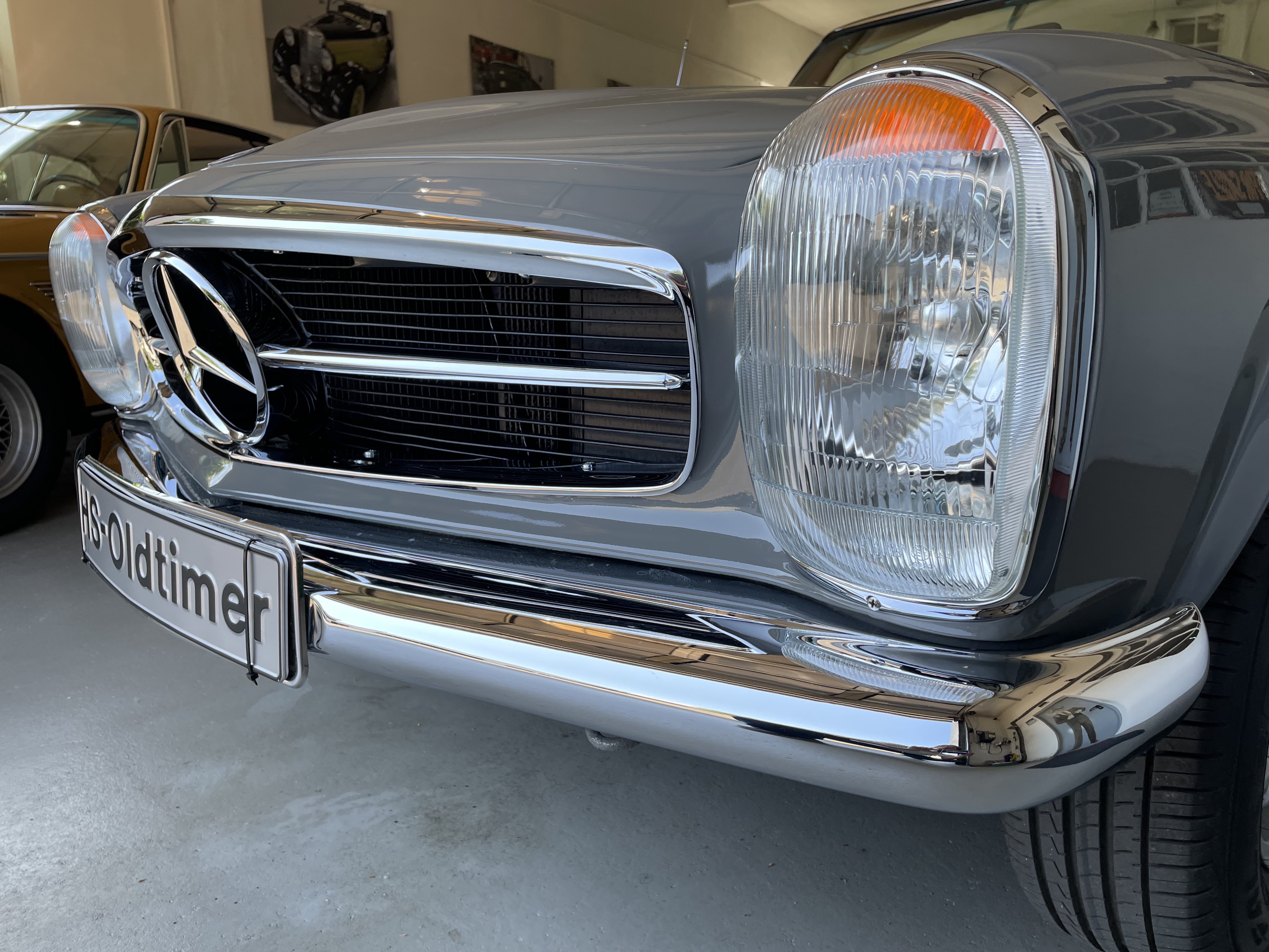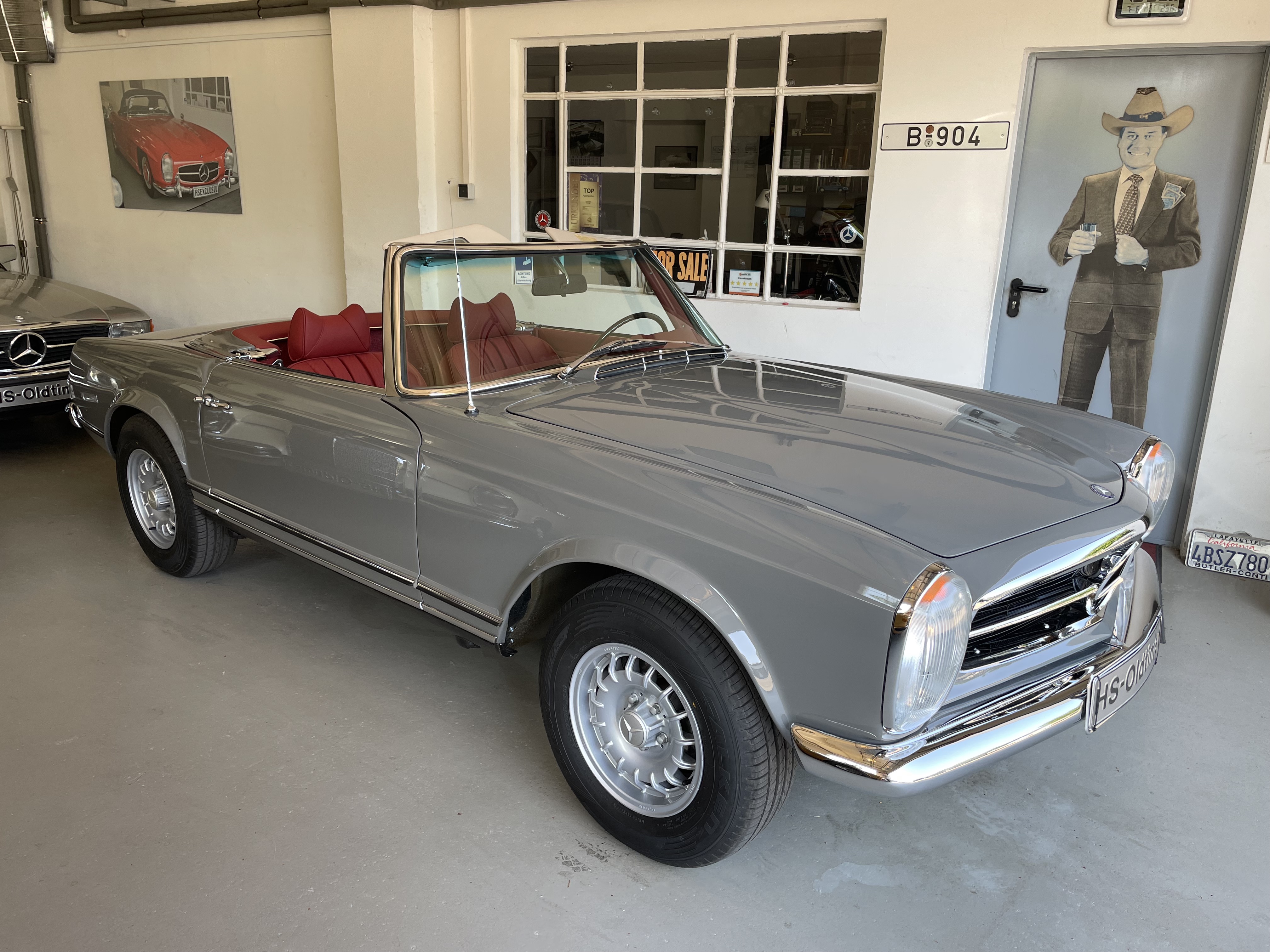Diese Pagode ist aufwendig restauriert worden. TÜV und H-Abnahme sind natürlich gemacht. Deutscher Brief ist vorhanden. Original Farbgebung: Die Außenfarbe ist 124 G arabergrau und das Hardtop ist 173 G anthrazitgrau. Fährt sich phantastisch. Schon 800 Kilometer nach Fertigstellung gefahren, jetzt passt alles. Wer eine besonders schöne 280 SL Pagode sucht, sollte sich diese auf jeden Fall einmal anschauen, es lohnt sich wie immer bei uns. Wir freuen uns auf Ihren Anruf und Besuch. Weitere Infos und schöne Oldtimer finden Sie auf unserer eigenen Homepage: www.hs-oldtimer.de
