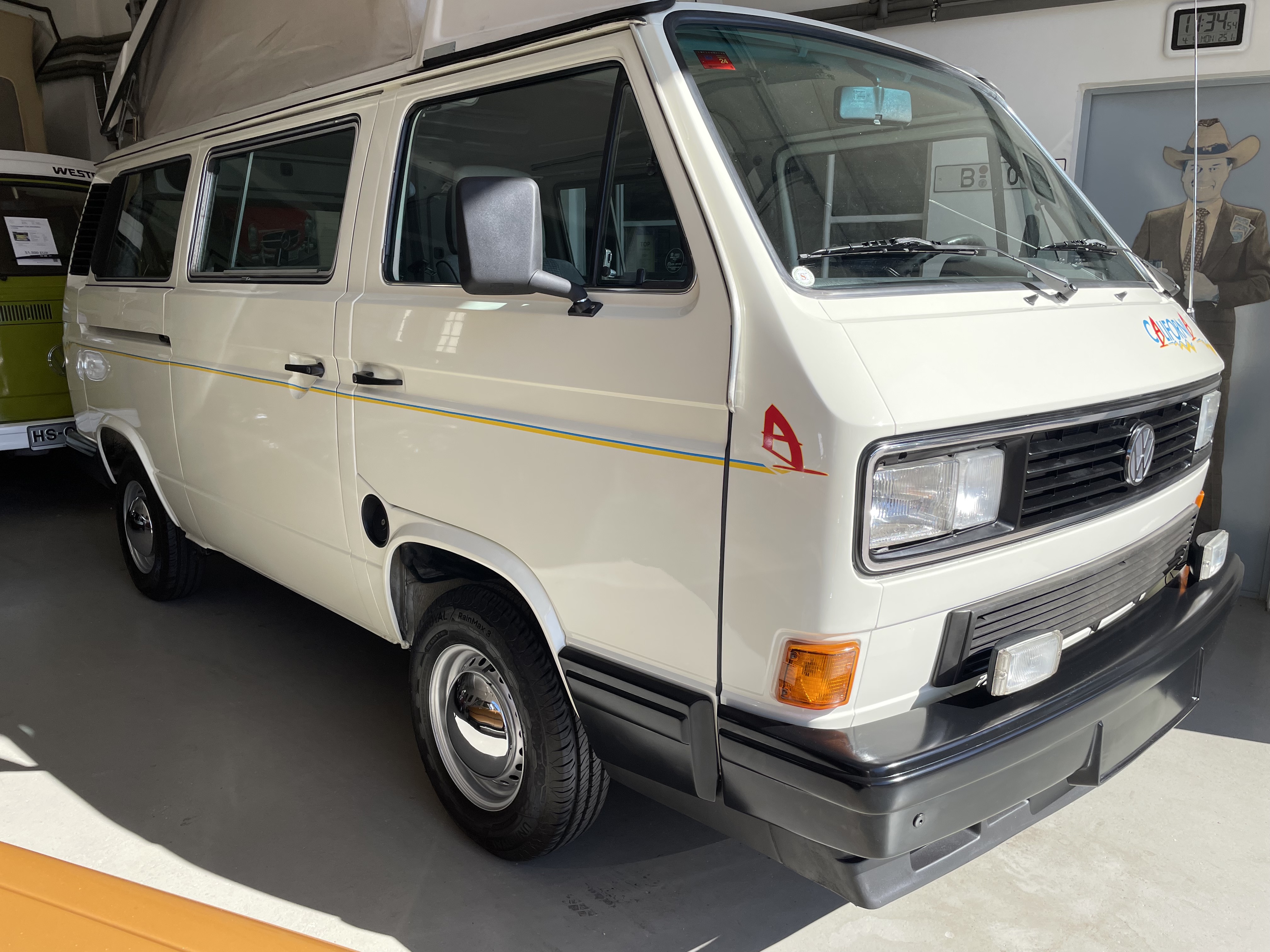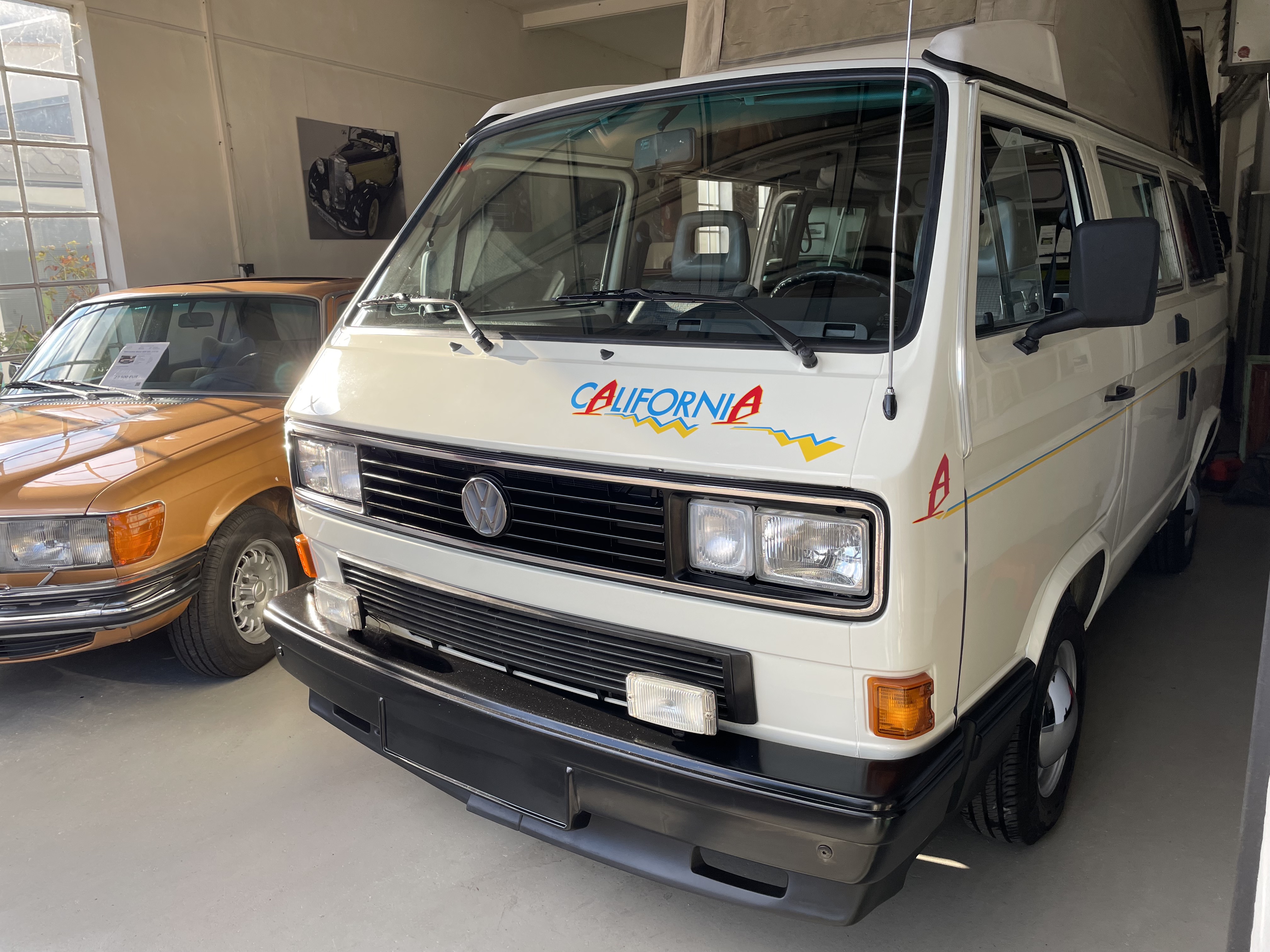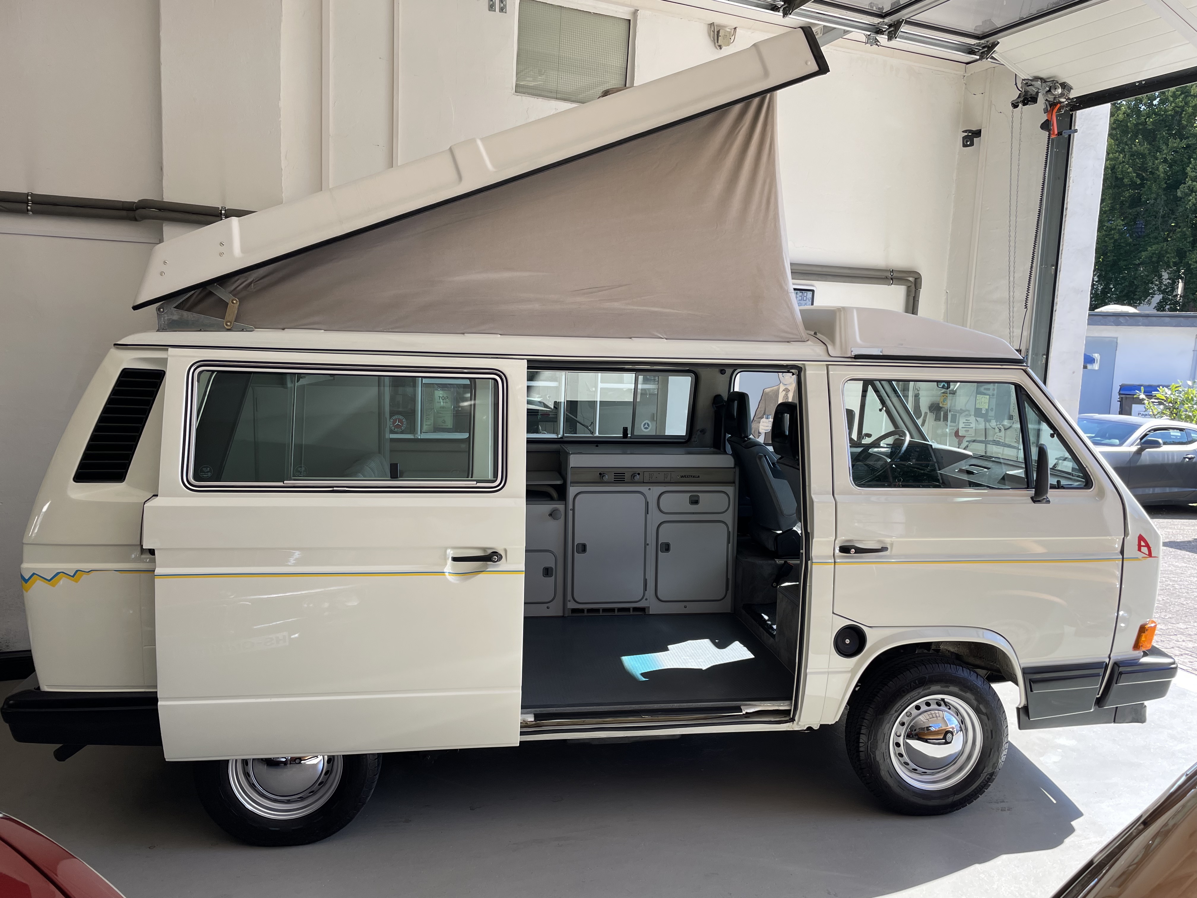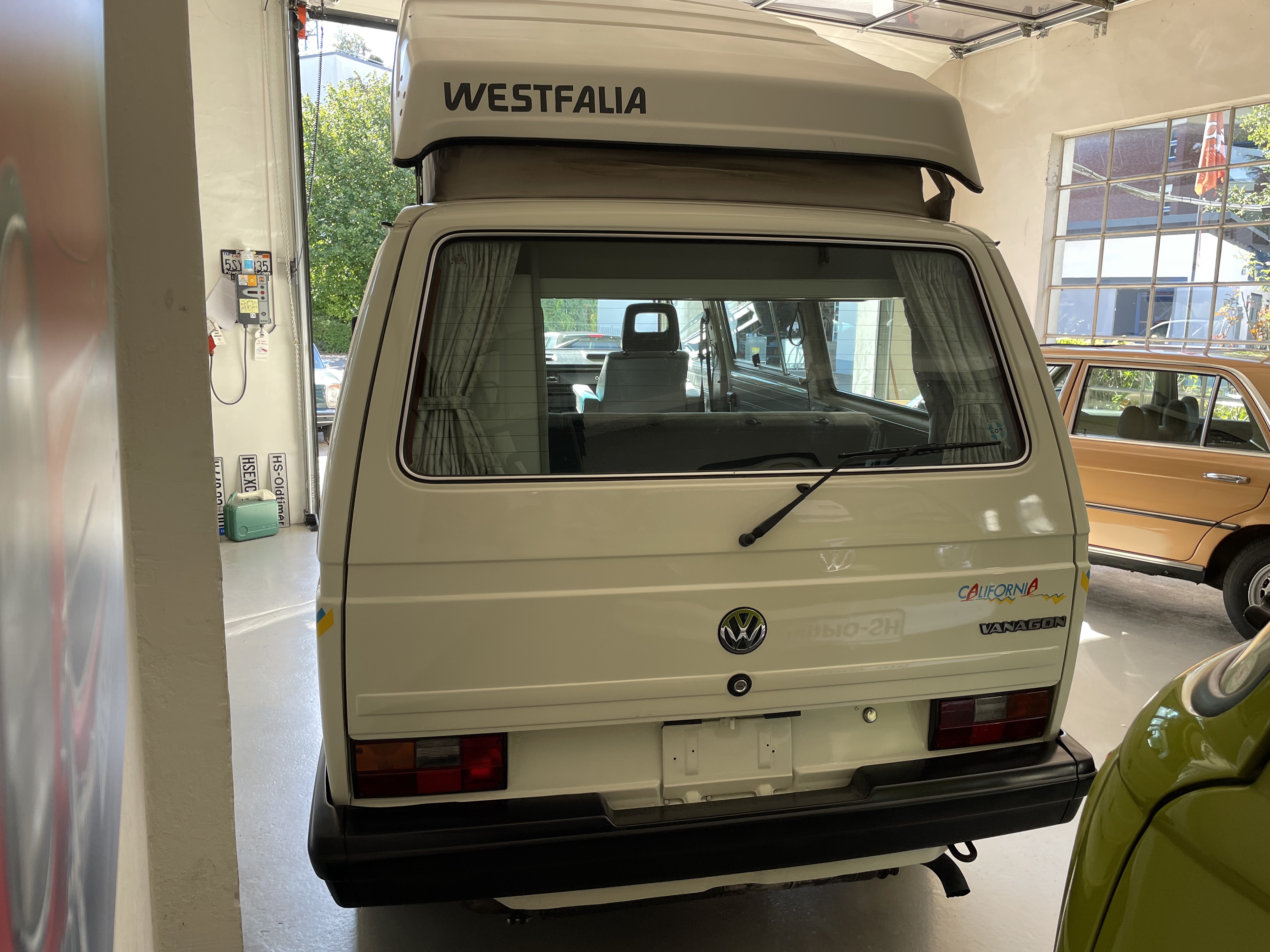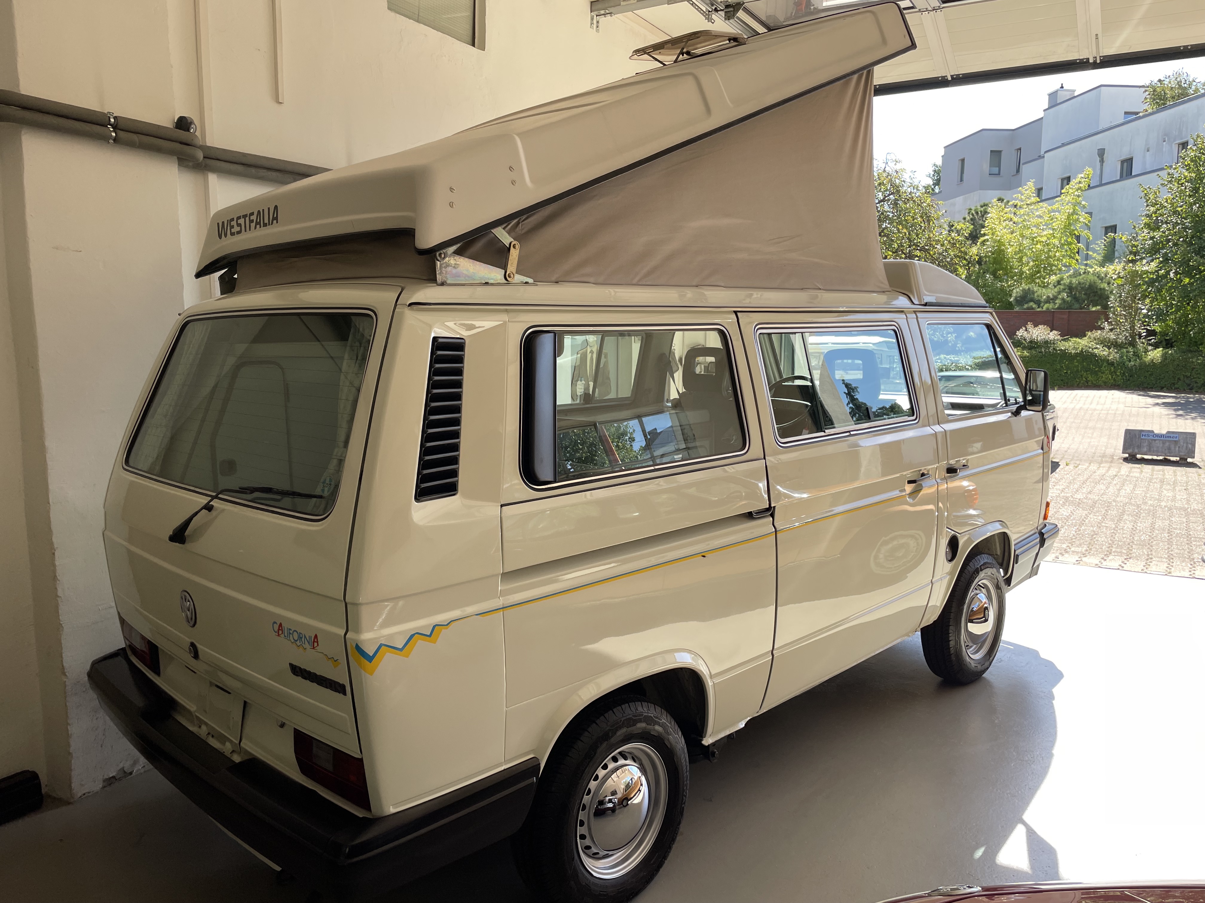 Gepflegter T3 California  Westfalia Camper mit Aufstelldach.  Sagenhafte Blechsubstanz, der Bulli kommt aus Südeuropa.  Die TÜV und H-Abnahme, Gasprüfung inkl. einer Inspektion mit Zahnriemen, Rifen etc., hier wurde viel gemacht.  Bis auf Kleinigkeiten kein Handlungsbedarf.  Wer einen originalen und besonders guten T3 sucht, sollte sich diesen auf jeden Fall einmal anschauen, es lohnt sich wie immer bei uns. Wir freuen uns auf Ihren Anruf und Besuch. Weitere Infos und schöne Oldtimer finden Sie auf unserer eigenen Homepage: www.hs-oldtimer.de